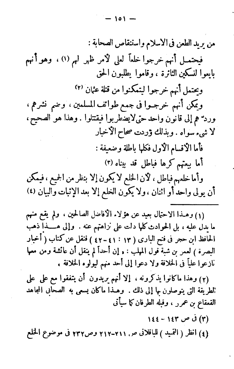(¬1) وهذا الاحتمال بعيد عن هؤلاء الأفاضل الصالحين، ولم يقع منهم ما يدل عليه، بل الحوادث كلها دلت علي نزاهتهم عنه. وإلى هذا ذهب الحافظ ابن حجر في فتح الباري (13 - 41: 42) فنقل عن كتاب (أخبار البصرة) لعمر بن شبة قول المهلب: "إن أحدا لم ينقل أن عائشة ومن معها نازعوا عليا في الخلافة، ولا دعوا إلى أحد منهم ليولوه الخلافة ".