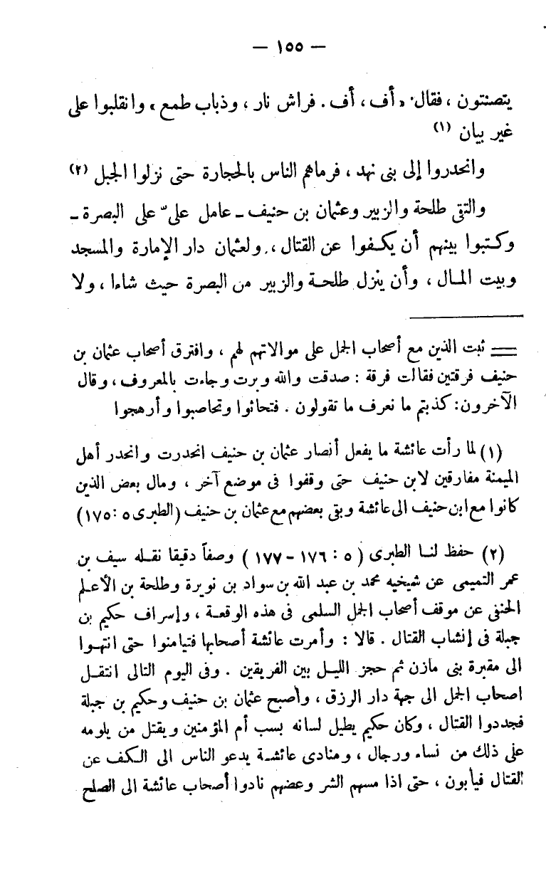 (¬1) لما رأت عائشة ما يفعل أنصار عثمان بن حنيف انحدرت وانحدر أهل الميمنة مفارقتين لابن حنيف حتى وقفوا في موضع آخر. ومال بعض الذين كانوا مع ابن حنيف إلى عائشة وبقي بعضهم مع عثمان بن حنيف (الطبري 5: 175) .