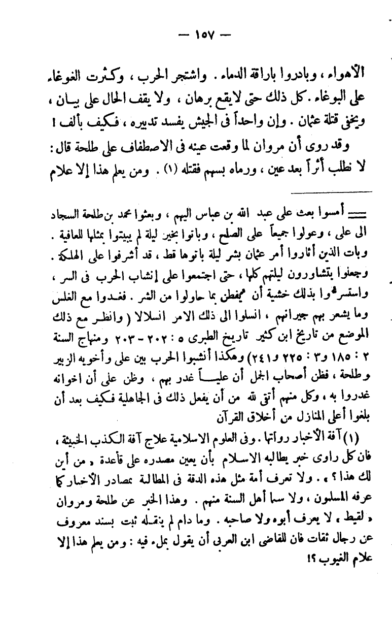 (¬1) آفة الأخبار رواتها. وفي العلوم الإسلامية علاج آفة الكذب الخبيثة، فإن كل راوي خبر يطالبه الإسلام بأن يعين مصدره على قاعدة "من أين لك هذا؟ ". ولا تعرف أمة مثل هذه الدقة في المطالبة بمصادر الأخبار كما عرفه المسلمون، ولا سيما أهل السنة منهم. وقد أشاد بهذه المزية لعلماء السنة الدكتور أسد رستم في كتابه (مصطلح التاريخ) . وهذا الخبر عن طلحة ومروان "لقيط" لا يعرف أبيه ولا صاحبه. وما دام لم ينقله ثبت بسند معروف عن رجال ثقات فإن للقاضي ابن العربي أن يقول بملء فيه. ومن يعلم هذا إلا علام الغيوب؟! .