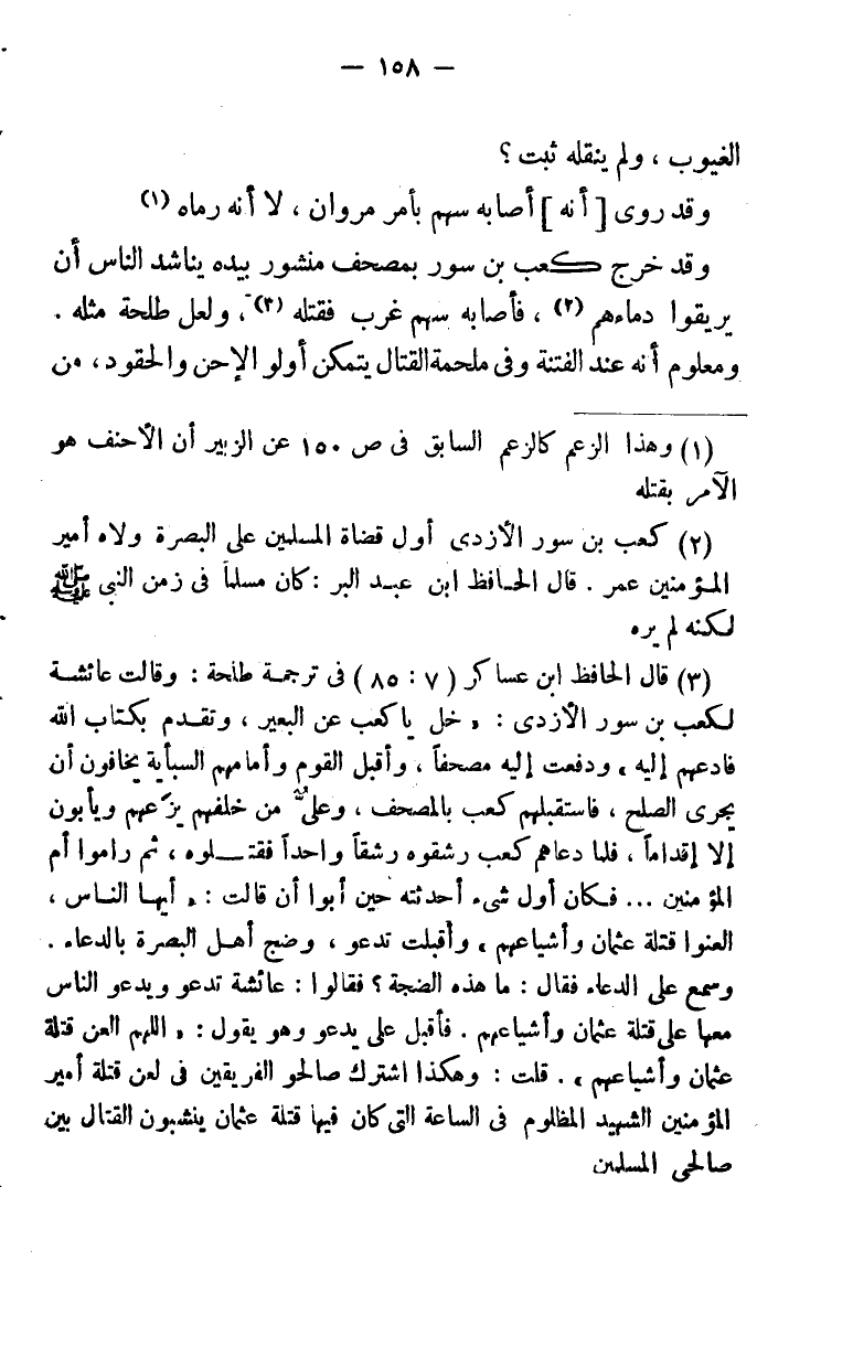 (¬3) قال الحافظ ابن عساكر (7: 85) في ترجمة طلحة: وقالت عائشة لكعب بن سور الأزدري: "خل يا كعب عن البعير، وتقدم بكتاب الله فادعهم إليه، ودفعت إليه مصحفا وأقبل القوم وأمامهم السبئية يخافون أن يجري الصلح، فاستقبله كعب بالمصحف، وعلي من خلفهم يزعهم ويأبون إلا إقداما. فلما دعاهم كعب رشقوه رشقا واحدا فقتلوه ثم راموا أم المؤمنين. . . فكان أول شيء أحدثته حين أبوا أن قالت: "يا أيها الناس، العنوا قتلة عثمان وأشياعهم" وأقبلت تدعو، وضج أهل البصرة بالدعاء. وسمع علي الدعاء فقال: ما هذه الضجة؟ فقالوا: عائشة تدعوا ويدعوا الناس معها على قتلة عثمان وأشياعهم. فأقبل علي يدعوا وهو يقول: "اللهم العن قتلة عثمان وأشياعهم" قلت: وهكذا اشترك صالحو الفريقين في لعن قتلة أمير المؤمنين الشهيد المظلوم في الساعة التي كان فيها قتلة عثمان ينشبون القتال بين صالحي المسلمين.