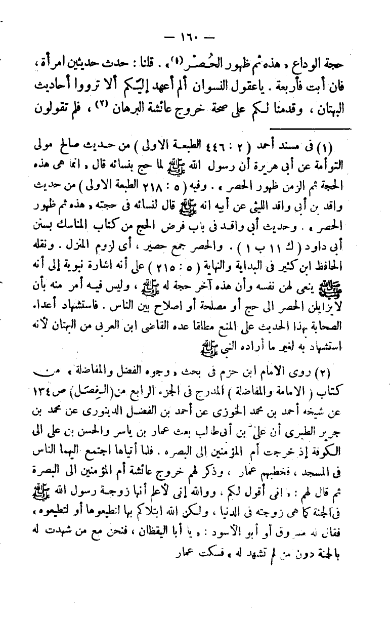 (¬1) في مسند أحمد (2: 446 الطبعة الأولى) من حديث صالح مولى التوأمة عن أبي هريرة أن رسول الله صلى الله عليه وسلم لما حج بنسائه قال ((إنما هي هذه الحجة ثم الزمن ظهور الحصر)) . وفيه (5: 218 الطبعة الأولى) من حديث واقد بن أبي واقد الليثي عن أبيه أنه صلى الله عليه وسلم قال لنسائه في حجته ((هذه ثم ظهور الحصر)) ، وحديث أبي واقد في باب فرض الحج من كتاب المناسك بسنن أبي داود (ك 11 ب 1) . والحصر جمع حصير، أي لزوم المنزل. ونقله الحافظ ابن كثير في البداية والنهاية (5: 215) على أنه إشارة نبوية إلى أنه صلى الله عليه وسلم ينعى لهن نفسه، وأن هذه آخر حجة له صلى الله عليه وسلم، وليس فيه أمر منه بأن لا يزيلن الحصر إلى حج أو مصلحة أو إصلاح بين الناس. فاستشهاد أعداء الصحابة بهذا الحديث على المنع مطلقًا عده القاضي ابن العربي من البهتان، لأنه استشهاد به لغير ما أراده النبي صلى الله عليه وسلم.