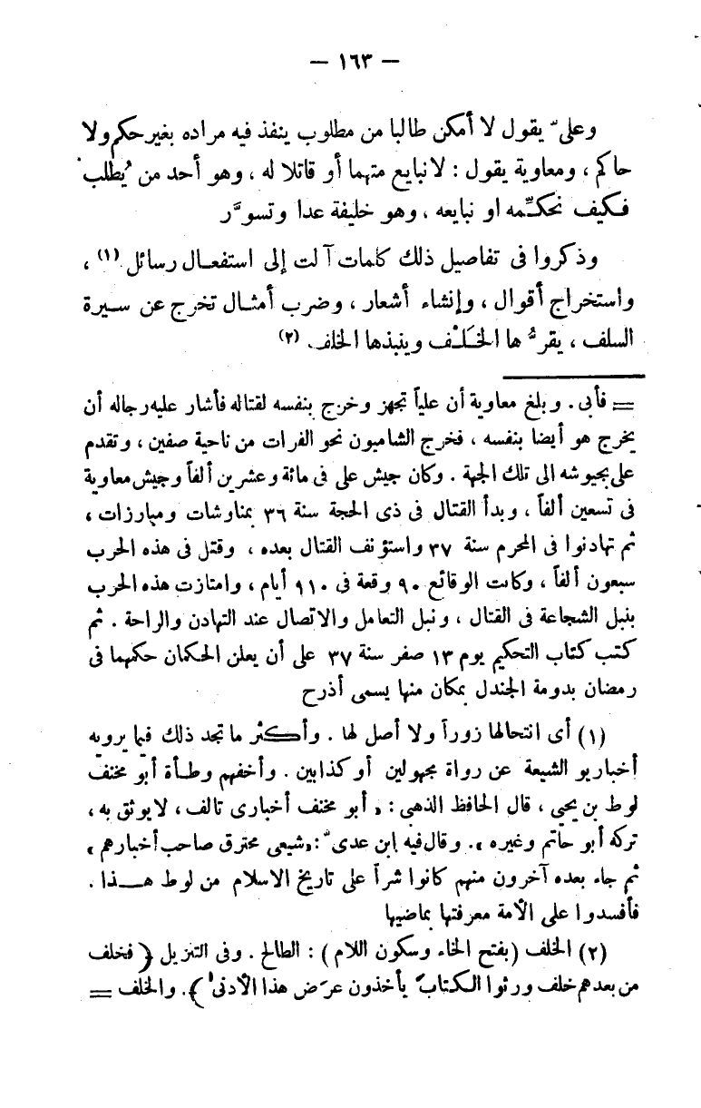 وعلي يقول لا أمكن طالبًا من مطلوب ينفذ فيه مراده بغير حكم ولا حاكم. ومعاوية يقول: لا نبايع متهمًا أو قاتلًا له، وهو أحد من يطلب فكيف نحكمه أو نبايعه، وهو خليفة عدا وتسور.