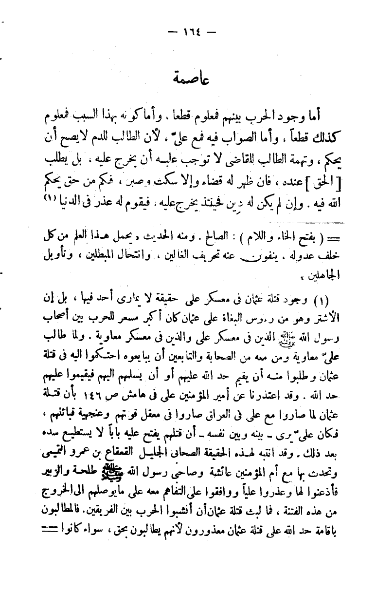 عاصمة أما وجود الحرب بينهم فمعلوم قطعًا، وأما كونه بهذا السبب فمعلوم كذلك قطعًا، وأما الصواب فيه فمع علي، لأن الطالب للدم لا يصح أن يحكم، وتهمة الطالب للقاضي لا توجب عليه أن يخرج عليه، بل يطلب [الحق] عنده، فإن ظهر له قضاء وإلا سكت وصبر، فكم من حق يحكم الله فيه. وإن لم يكن له دين فحينئذ يخرج عليه، فيقوم له عذر في الدنيا (¬1) .
