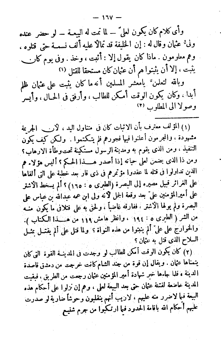 (¬1) المؤلف معترف بأن الإثبات كان في متناول اليد، لأن الجريمة مشهودة والمجرمون أعلنوا فيها فجورهم فلم يتكتموا. ولكن كيف يكون التنفيذ، ومن الذي يقوم به ومدينة الرسول مستكينة تحت وطأة الإرهاب؟ ومن ذا الذي يضمن لعلي حياته إذا أصدر هذا الحكم؟ أليس هؤلاء هم الذين تداولوا في قتله لما عقدوا مؤتمرهم في ذي قار بعد خطبة علي التي ألقاها على الغرائر قبيل مصيره إلى البصرة (الطبري 5: 165) ألم يسخط الأشتر على أمير المؤمنين علي بعد وقعة الجمل لأنه ولى ابن عمه عبد الله بن عباس على البصرة ولم يولها الأشتر، ففارقه غاضبًا، ولحق به علي فتلافى ما يكون منه من الشر (الطبري 5: 194) ، وانظر هامش 119 من هذا الكتاب) . والخوارج على علي ألم ينبتوا من هذه النواة؟ ولما قتل علي ألم يقتل بمثل السلاح الذي قتل به عثمان؟ .