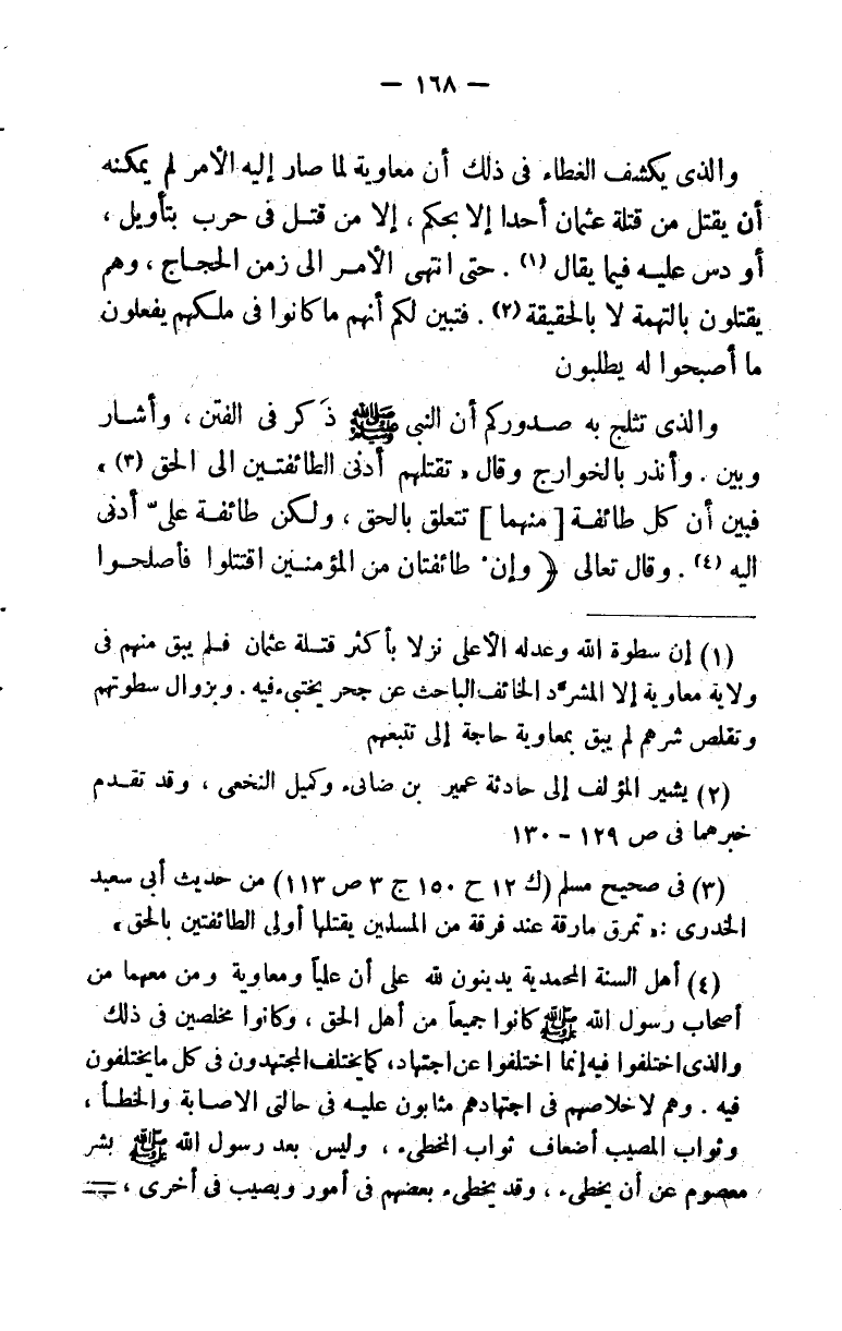 (¬4) أهل السنة المحمدية يدينون لله على أن عليًّا ومعاوية، ومن معها من أصحاب رسول الله صلى الله عليه وسلم كانوا جميعًا من أهل الحق، وكانوا مخلصين في ذلك. والذي اختلفوا فيه إنما اختلفوا عن اجتهاد، كما يختلف المجتهدون في كل ما يختلفون فيه. وهم - لإخلاصهم في اجتهادهم - مثابون عليه في حالتي الإصابة والخطأ، وثواب المصيب أضعاف ثواب المخطئ، وليس بعد رسول الله صلى الله عليه وسلم بشر معصوم عن أن يخطئ وقد يخطئ بعضهم في أمور ويصيب في أخرى، وكذلك الآخرون. أما من مرق عن الحق في إثارة الفتنة الأولى على عثمان فلا يعد من إحدى الطائفتين اللتين على الحق وإن قاتل معها والتحق بها، لأن الذين تلوثت أيديهم ونياتهم وقلوبهم بالبغي الظالم على أمير المؤمنين عثمان - كائنًا من كانوا - استحقوا إقامة الحد الشرعي عليهم سواء استطاع ولي الأمر أن يقيم عليهم هذا الحد أو لم يستطع. وفي حالة عدم استطاعته فإن مواصلتهم تسعير القتال بين صالحي المسلمين كلما أحسوا منهم بالعزم على الإصلاح والتآخي - كما فعلوا في وقعة الجمل وبعدها - يعد إصرارًا منهم على الاستمرار في الإجرام ما داموا على ذلك، فإذا قلنا إن الطائفتين كانتا من أهل الحق فإنما نريد أصحاب رسول الله صلى الله عليه وسلم الذين كانوا في الطائفتين ومن سار معهم على سنته صلى الله عليه وسلم من التابعين، ونرى أن عليًّا المبشر بالجنة أعلى مقامًا عند الله من معاوية خال المؤمنين وصاحب رسول رب العالمين، وكلاهما من أهل الخير. وإذا اندس فيهم طوائف من أهل الشر فإن من يعمل مثقال ذرة خيرًا يره، ومن يعمل مثقال ذرة شرًا يره. نقل الحافظ ابن كثير في البداية والنهاية (7: 277) عن عبد الرحمن بن زياد بن أنعم الشعباني قاضي إفريقية المتوفى سنة 56 كان رجلًا صالحًا من الآمرين بالمعروف - وذكر أهل صفين - فقال: ((كانوا عربًا يعرف بعضهم بعضًا في الجاهلية، فالتقوا في الإسلام معهم على الحمية وسنة الإسلام، فتصابروا، واستحيوا من الفرار، وكانوا إذا تحاجزوا دخل هؤلاء في عسكر هؤلاء وهؤلاء في عسكر هؤلاء، فيستخرجون قتلاهم فيدفنونهم)) ، قال الشعبي: ((هم أهل الجنة، لقي بعضهم بعضًا، فلم يفر أحد من أحد)) .