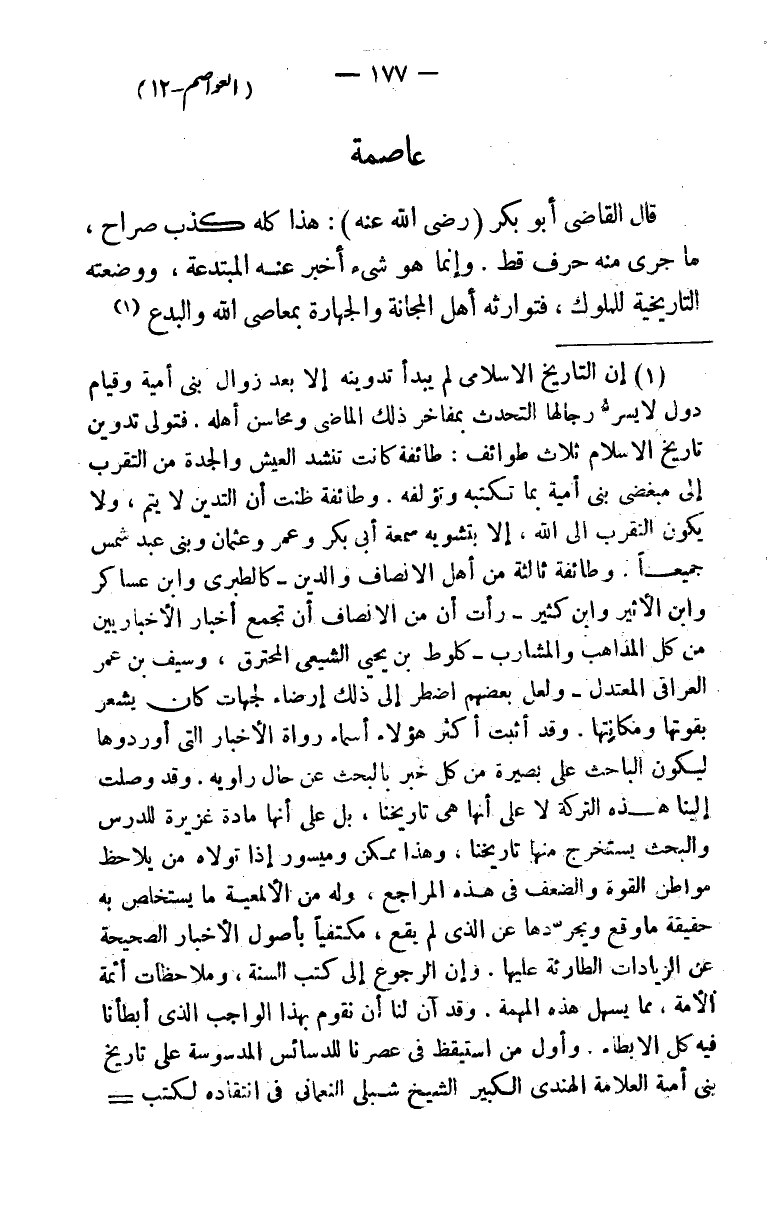عاصمة قال القاضي أبو بكر (رضي الله عنه) : هذا كله كذب صراح ما جرى منه حرف قط. وإنما هو شيء أخبر عنه المبتدعة، ووضعته التاريخية للملوك، فتوارثه أهل المجانة والجهارة بمعاصي الله والبدع (¬1) .