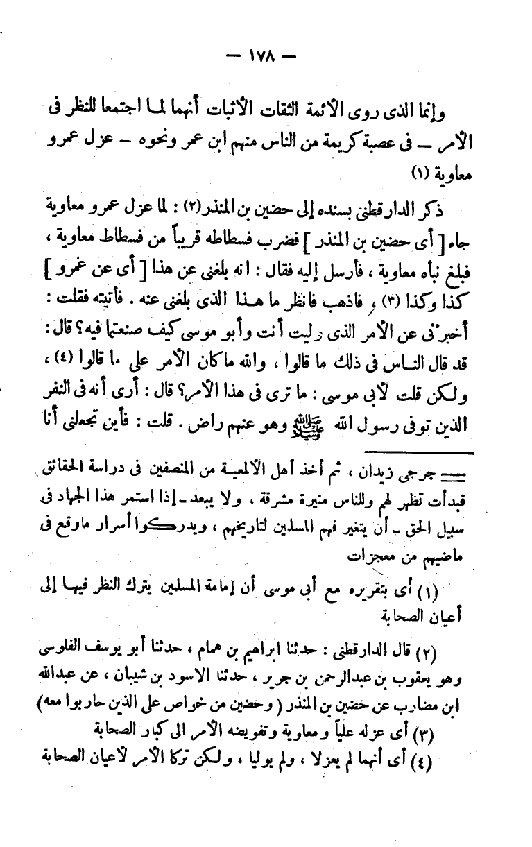ذكر الدارقطني بسنده إلى حضين بن المنذر (¬2) لما عزل عمرو معاوية جاء [أي حضين بن المنذر] فضرب فسطاطه قريبًا من فسطاط معاوية، فبلغ نبأه معاوية، فأرسل إليه فقال: إنه بلغني عن هذا [أي عن عمرو] كذا وكذا (¬3) فاذهب فانظر ما هذا الذي بلغني عنه، فأتيته فقلت: أخبرني عن الأمر الذي وليت أنت وأبو موسى كيف صنعتما فيه؟ قال: قد قال الناس في ذلك ما قالوا، والله ما كان الأمر على ما قالوا (¬4) ولكن قلت لأبي موسى: ما ترى في هذا الأمر؟ قال أرى أنه في النفر الذين توفي رسول الله صلى الله عليه وسلم وهو عنهم راضٍ. قلت: فأين تجعلني أنا ومعاوية؟ فقال: إن يستعن بكما ففيكما معونة، وإن يستغن عنكما