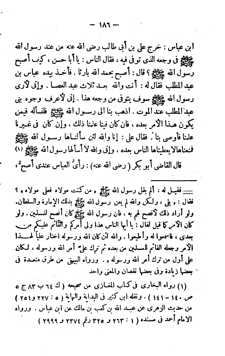 (¬1) رواه البخاري في كتاب المغازي من صحيحه (ك 64 ب 83 - ج 5 ص 140 - 141) . ونقله ابن كثير في البداية والنهاية (5: 227 و 251) من حديث الزهري عن عبد الله بن كعب بن مالك عن ابن عباس. ورواه الإمام أحمد في مسنده (1: 263 و 325 و 2374 و 2999) .