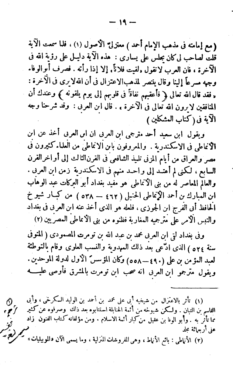الأنماطي في الإسكندرية. والمعرفون بابن الأنماطي من العلماء كثيرون في مصر والعراق من أيام المزني تلميذ الشافعي في القرن الثالث إلى أواخر القرن السابع، لكني لم أهتد إلى واحد منهم في الإسكندرية زمن ابن العربي. والعالم المعاصر له من بني الأنماطي هو مفيد بغداد أبو البركات عبد الوهاب بن المبارك بن أحمد الأنماطي الحنبلي (462-538) من كبار شيوخ الحافظ أبي الفرج بن الجوزي فلعله هو الذي أخذ عنه ابن العربي في بغداد والتبس الأمر على مترجميه المغاربة فظنوه من بني الأنماطي المصريين (¬1) .