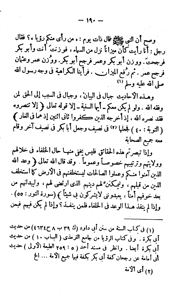 (¬1) في كتاب السنة من سنن أبي داود (ك 39 ب 8 ح 4634) من حديث أبي بكرة. وفي كتاب الرؤيا من جامع الترمذي (الباب 10) من حديث أبي بكرة أيضا. وانظر في مسند أحمد (5: 259) الطبعة الأولى حديث أبي أمامة عن رجحان كفة أبي بكر بكفة فيها جميع الأمة. . . إلخ.