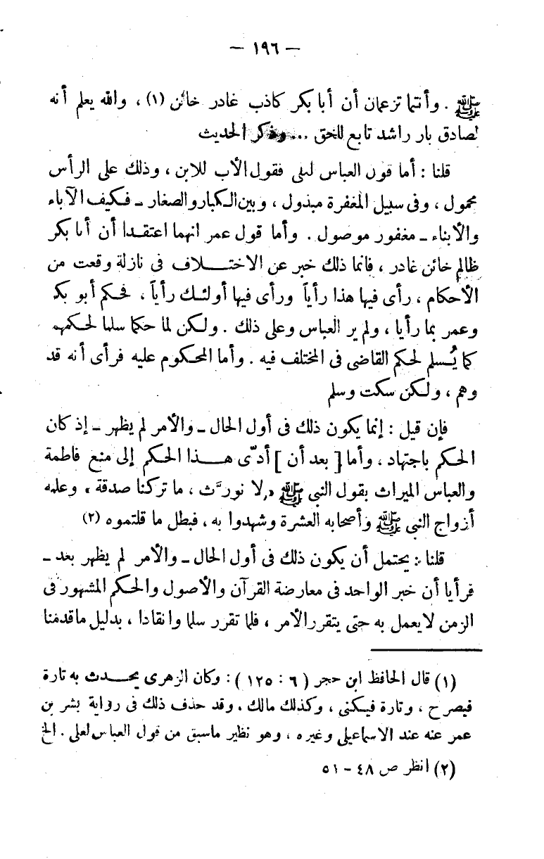 قلنا: أما قول العباس لعلي فقول الأب للابن، وذلك على الرأي محمول، وفي سبيل المغفرة مبذول، وبين الكبار والصغار - فكيف الآباء والأبناء - مغفور موصول، وأما قول عمر أنهما اعتقدا أن أبا بكر ظالم خائن غادر، فإنما ذلك خبر عن الاختلاف في نازلة وقعت من الأحكام، رأى فيها هذا رأيا ورأى فيها أولئك رأيا، فحكم أبو بكر وعمر بما رأيا، ولم ير العباس وعلي ذلك. ولكن لما حكما سلما لحكمهما كما يسلم لحكم القاضي في المختلف فيه. وأما المحكوم عليه فرأى أنه قد وهم، ولكن سكت وسلم.