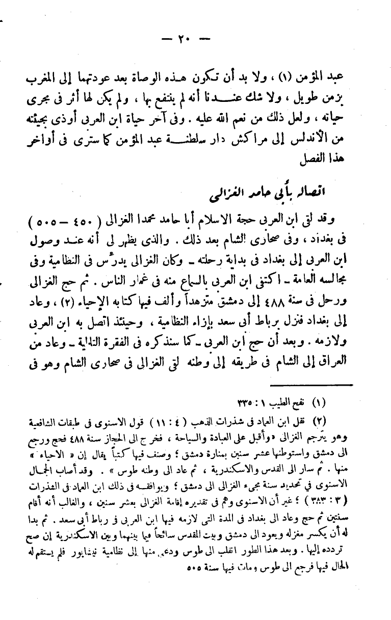 (¬1) نقل ابن العماد في شذرات الذهب (4: 11) قول الأسنوي في طبقات الشافعية وهو يترجم الغزالي " وأقبل على العبادة والسياحة فخرج إلى الحجاز سنة 488 فحج ورجع إلى دمشق واستوطنها عشر سنين بمنارة دمشق، وصنف فيها كتبا يقال إن (الأحياء) منها ثم سار إلى القدس والإسكندرية ثم عاد إلى وطنه طوس " ونبهني الأستاذ الشيخ محمد صبري عابدين إلى أن في ترجمة الغزالي بكتاب الأنس الجليل (1: 265) ما نصه: " وأخذ في التصانيف المشهورة ببيت المقدس، فيقال إنه صنف في القدس (إحياء علوم الدين) وأقام بالزاوية التي على باب الرحمة المعروفة قبل ذلك بالناصرية شرقي بيت المقدس، فسميت بالغزالية نسبة إليه ". وقد أصاب الجمال الأسنوي في تحديد سنة مجيء الغزالي إلى دمشق، ويوافقه في ذلك ابن العماد في الشذرات (3: 383) ، غير أن الأسنوي وهم في تقديره إقامة الغزالي بعشر سنين، والغالب أنه قام سنتين ثم حج وعاد إلى بغداد في المدة التي لازمه فيها ابن العربي في رباط أبي سعد. ثم بدا له أن يكسر مغزله ويعود إلى دمشق وبيت المقدس سائحا فيما بينهما وبين الإسكندرية إن صح تردده إليها، وبعد هذا الطور انقلب إلى طوس ودعي منها إلى نظامية نيسابور فلم يستقم له الحال فيها فرجع إلى طوس ومات فيها سنة 505.