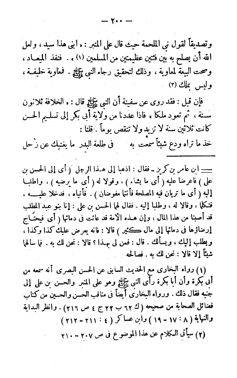 (¬1) رواه البخاري مع الحديث السابق عن الحسن البصري أنه سمعه من أبي بكرة وأن أبا بكرة رأى النبي صلى الله عليه وسلم وهو على المنبر والحسن بن علي إلى جنبه فقال ذلك، ورواه البخاري أيضا في مناقب الحسن والحسين من كتاب فضائل الصحابة من صحيحه (ك 62 ب 22 - ج 4 ص 216) ، وانظر البداية والنهاية (8: 17 - 19) وابن عساكر (4: 211 212) .