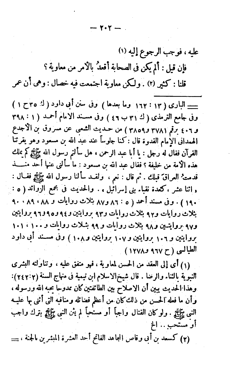 (¬1) أي إلى العقد من الحسن لمعاوية، فهو متفق عليه، وتناولته البشرى النبوية بالثناء والرضا. قال شيخ الإسلام ابن تيمية في منهاج السنة (2: 242) : وهذا الحديث يبين أن الإصلاح بين الطائفتين كان ممدوحا يحبه الله ورسوله، وأن ما فعله الحسن من ذلك كان من أعظم فضائله ومناقبه التي أثنى بها عليه النبي صلى الله عليه وسلم. ولو كان القتال واجبا أو مستحبا لم يثن النبي صلى الله عليه وسلم بترك واجب أو مستحب. . . إلخ.