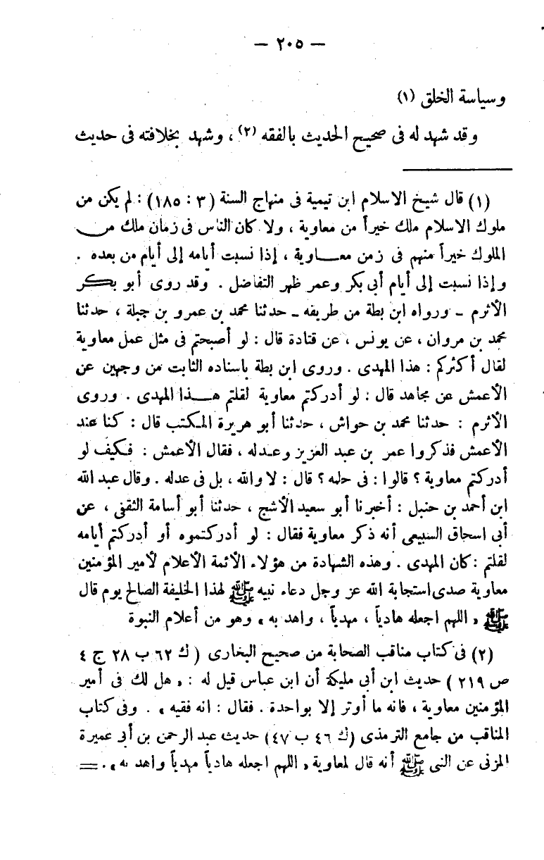 (¬1) قال شيخ الإسلام ابن تيمية في (منهاج السنة 3: 185) : لم يكن من ملوك الإسلام ملك خيرا من معاوية، ولا كان الناس في زمان ملك من الملوك خيرا منهم في زمن معاوية، إذا نسبت أيامه إلى من بعده. وإذا نسبت إلى أيام أبي بكر وعمر ظهر التفاضل. وقد روى أبو بكر الأثرم -ورواه ابن بطة من طريقه- حدثنا محمد بن عمرو بن جبلة، حدثنا محمد بن مروان، عن يونس، عن قتادة قال: لو أصبحتم في مثل عمل معاوية لقال أكثركم: هذا المهدي. وروى ابن بطة بإسناده الثابت من وجهين عن الأعمش عن مجاهد قال: لو أدركتم معاوية لقلتم هذا المهدي. وروى الأثرم: حدثنا أحمد بن جوّاس، حدثنا أبو هريرة المكتب قال: كنا عند الأعمش فذكروا عمر بن عبد العزيز وعدله، فقال الأعمش: فكيف لو أدركتم معاوية؟ قالوا: في حلمه؟ قال: لا والله، بل في عدله. وقال عبد الله بن أحمد بن حنبل: أخبرنا أبو سعيد الأشج، حدثنا أبو أسامة الثقفي، عن أبي إسحاق السبيعي أنه ذكر معاوية فقال: لو أدركتموه أو أدركتم أيامه لقلتم: كان المهدي. وهذه الشهادة من هؤلاء الأئمة الأعلام لأمير المؤمنين معاوية صدى استجابة الله عز وجل دعاء نبيه صلى الله عليه وسلم لهذا الخليفة الصالح يوم قال صلى الله عليه وسلم " اللهم اجعله هاديا، مهديا واهد به " وهو من أعلام النبوة.
