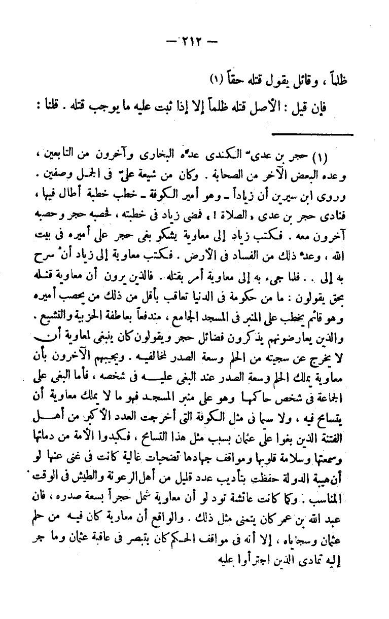 (¬1) حجر بن عدي الكندي عده البخاري وآخرون من التابعين. وعده البعض الآخر من الصحابة. وكان من شيعة علي في الجمل وصفين. وروى ابن سيرين أن زيادا - وهو أمير الكوفة - خطب خطبة أطال فيها، فنادى حجر بن عدي " الصلاة! " فمضى زياد في خطبته، فحصبه حجر وحصبه آخرون معه. فكتب زياد إلى معاوية يشكو بغي حجر على أميره في بيت الله، وعد ذلك من الفساد في الأرض. فكتب معاوية إلى زياد أن سرح به إلي. . . فلما جيء به إلى معاوية أمر بقتله. فالذين يريدون أن معاوية قتله بحق يقولون: ما من حكومة في الدنيا تعاقب بأقل من ذلك من يحصب أميره وهو قائم يخطب على المنبر في المسجد الجامع، مندفعا بعاطفة الحزبية والتشيع. والذين يعارضونهم يذكرون فضائل حجر ويقولون: كان ينبغي لمعاوية أن لا يخرج عن سجيته من الحلم وسعة الصدر لمخالفيه. ويجيبهم الآخرون بأن معاوية يملك الحلم وسعة الصدر عند البغي عليه في شخصه، فأما البغي على الجماعة في شخص حاكمها وهو على منبر المسجد فهو ما لا يملك معاوية أن يتسامح فيه، ولا سيما في مثل الكوفة التي أخرجت العدد الأكبر من أهل الفتنة الذين بغوا على عثمان بسبب مثل هذا التسامح، فكبدوا الأمة من دمائها وسمعتها وسلامة قلوبها ومواقف جهادها تضحيات غالية كانت في غنى عنها لو أن هيبة الدولة حفظت بتأديب عدد قليل من أهل الرعونة والطيش في الوقت المناسب. وكما كانت عائشة تود لو أن معاوية شمل حجرا بسعة صدره، فإن عبد الله بن عمر كان يتمنى مثل ذلك. والواقع أن معاوية كان فيه من حلم عثمان وسجاياه، إلا أنه في مواقف الحكم كان يتبصر في عاقبة عثمان وما جر إليه تمادي الذين اجترأوا عليه.