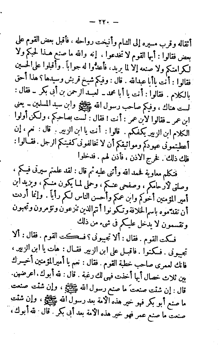 وأنيخت رواحله، فأقبل بعض القوم على بعض فقالوا: أيها القوم لا تخدعوا إنه والله ما صنع هذا لحبكم ولا لكرامتكم ولا صنعه إلا لما يريد، فأعدوا له جوابًا، أقبلوا على الحسين فقالوا: أنت يا أبا عبد الله. قال: وفيكم شيخ قريش وسيدها؟ هذا أحق بالكلام. فقالوا: أنت يا أبا محمد - لعبد الرحمن بن أبي بكر - فقال. لست هناك، وفيكم صاحب رسول الله صلى الله عليه وسلم وابن سيد المسلمين - يعني ابن عمر - فقالوا لابن عمر: أنت! فقال: لست بصاحبكم، ولكن أولوا الكلام ابن الزبير يكفكم. قالوا: أنت يا ابن الزبير. قال: نعم، إن أعطيتموني عهودكم ومواثيقكم أن لا تخالفوني كفيتكم الرجل. فقالوا: فلك ذلك. فخرج الإذن، فأذن لهم. فدخلوا.