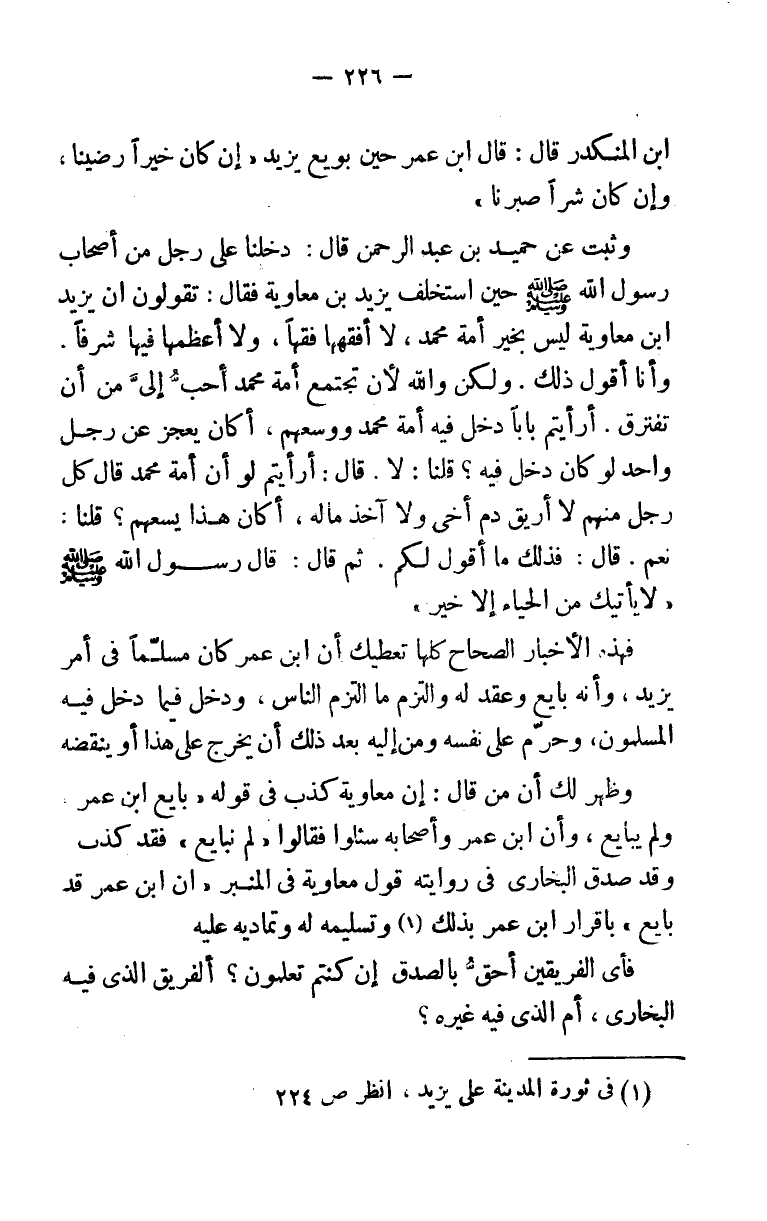 فهذه الأخبار الصحاح كلها تعطيك أن ابن عمر كان مسلمًا في أمر يزيد، وأنه بايع وعقد له والتزم ما التزم الناس، ودخل فيما دخل فيه المسلمون، وحرم على نفسه ومن إليه بعد ذلك أن يخرج على هذا أو ينقضه.