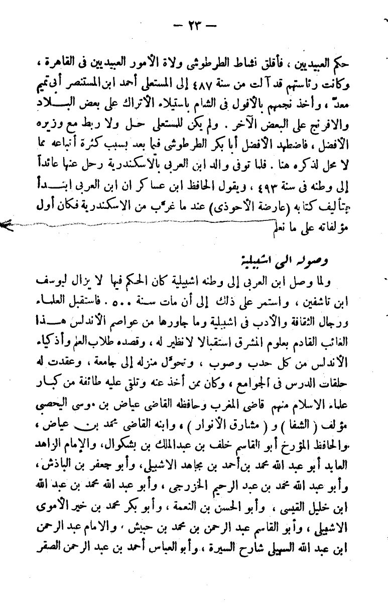 وصوله إلى إشبيلية: ولما وصل ابن العربي إلى وطنه إشبيلية كان الحكم فيها لا يزال ليوسف بن تاشفين، واستمر على ذلك إلى أن مات سنة 500. فاستقبل العلماء ورجال الثقافة والأدب في إشبيلية وما جاورها من عواصم الأندلس هذا الغائب القادم بعلوم المشرق استقبالا لا نظير له، وقصده طلاب العلم وأذكياء الأندلس من كل حدب وصوب، وتحول منزله إلى جامعة، وعقدت له حلقات الدرس في الجوامع، وكان ممن أخذ عنه وتلقى عليه طائفة من كبار علماء الإسلام: منهم قاضي المغرب وحافظه القاضي عياض بن موسى اليحصبي مؤلف (الشفا) و (مشارق الأنوار) ، وابنه القاضي محمد بن عياض، والحافظ المؤرخ أبو القاسم خلف بن عبد الملك بن بشكوال، والإمام الزاهد العابد أبو عبد الله محمد بن أحمد بن مجاهد الإشبيلي، وأبو جعفر بن الباذش، وأبو عبد الله محمد بن عبد الرحيم الخزرجي، وأبو عبد الله محمد بن عبد الله بن خليل القيسي، وأبو الحسن بن النعمة، وأبو بكر محمد بن خير الأموي الإشبيلي، وأبو القاسم عبد الرحمن بن محمد بن حبيش، والإمام عبد الرحمن بن عبد الله السهيلي شارح السيرة، وأبو العباس أحمد بن عبد الرحمن الصقر الأنصاري، وأبو الحسن علي بن عتيق القرطبي، وأبو القاسم أحمد بن محمد بن خلف الحوفي، وأبو محمد عبد الحق بن عبد الرحمن الأزدي الخراط، وأبو بكر محمد بن محمد اللخمي البلنقي، وأبو عبد الله محمد بن عبد الله الغاسل الغرناطي، وأبو الحسن عبد الرحمن بن أحمد بن بقي، وأبو العباس أحمد بن أبي الوليد بن رشد، وأبو محمد عبد الله بن أحمد بن سعيد العبدري شارح صحيح مسلم، وأبو المحاسن يوسف بن عبد الله بن عياد، والحافظ أبو الحجاج يوسف بن إبراهيم العبدري، والقاضي أحمد بن عبد الرحمن بن مضاء اللخمي وأبو إسحاق إبراهيم بن يوسف بن قرقول شارح مشارق الأنوار، وعالم لا يحصى