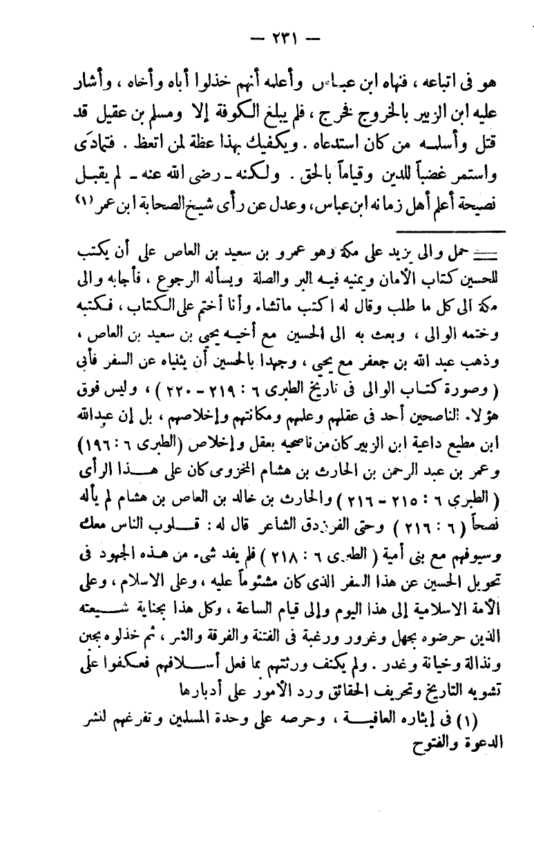 هو في اتِّباعه، فنهاه ابن عباس وأعلمه أنهم خذلوا أباه وأخاه، وأشار عليه ابن الزبير بالخروج فخرج، فلم يبلغ الكوفة إلا ومسلم بن عقيل قد قتل وأسلمه من كان استدعاه! ويكفيك بهذا عظة لمن اتعظ. فتمادى واستمر غضبًا للدين وقيامًا بالحق. ولكنه - رضي الله عنه - لم يقبل نصيحة أعلم أهل زمانه ابن عباس، وعدل عن رأي شيخ الصحابة ابن عمر (¬1) وطلب