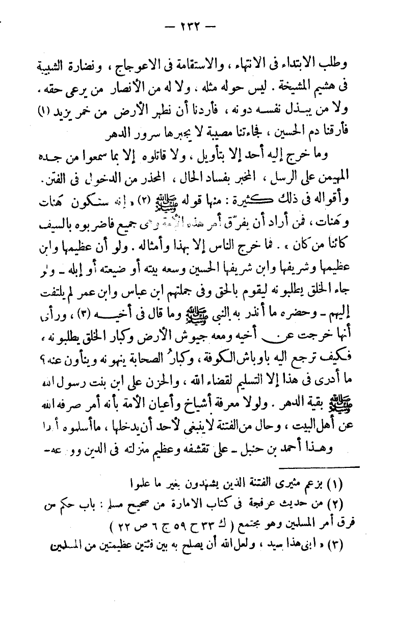 وما خرج إليه أحد إلا بتأويل، ولا قاتلوه إلا بما سمعوا من جده المهيمن على الرسل، المخبر بفساد الحال، المحذر من الدخول في الفتن. وأقواله في ذلك كثيرة: منها قوله صلى الله عليه وسلم (¬2) «إنه ستكون هنات وهنات، فمن أراد أن يفرق أمر هذه الأمة وهي جميع فاضربوه بالسيف كائنًا من كان» . فما خرج الناس إلا بهذا وأمثاله. ولو أن عظيمها وابن عظيمها وشريفها وابن شريفها الحسين وسعه بيته أو ضيعته أو إبله - ولو جاء الخلق يطلبونه ليقوم بالحق، وفي جملتهم ابن عباس وابن عمر - لم يلتفت إليهم، وحضره ما أنذر به النبي صلى الله عليه وسلم وما قال في أخيه (¬3) ورأى أنها خرجت عن أخيه ومعه جيوش الأرض وكبار الخلق يطلبونه، فكيف ترجع إليه بأوباش الكوفة، وكبار الصحابة ينهونه وينأون عنه؟ ما أدرى في هذا إلا التسليم لقضاء الله، والحزن على ابن بنت رسول الله صلى الله عليه وسلم بقية الدهر. ولولا معرفة أشياخ وأعيان الأمة بأنه أمر صرفه الله عن أهل البيت، وحال من الفتنة لا ينبغي لأحد أن يدخلها، ما أسلموه أبدا.