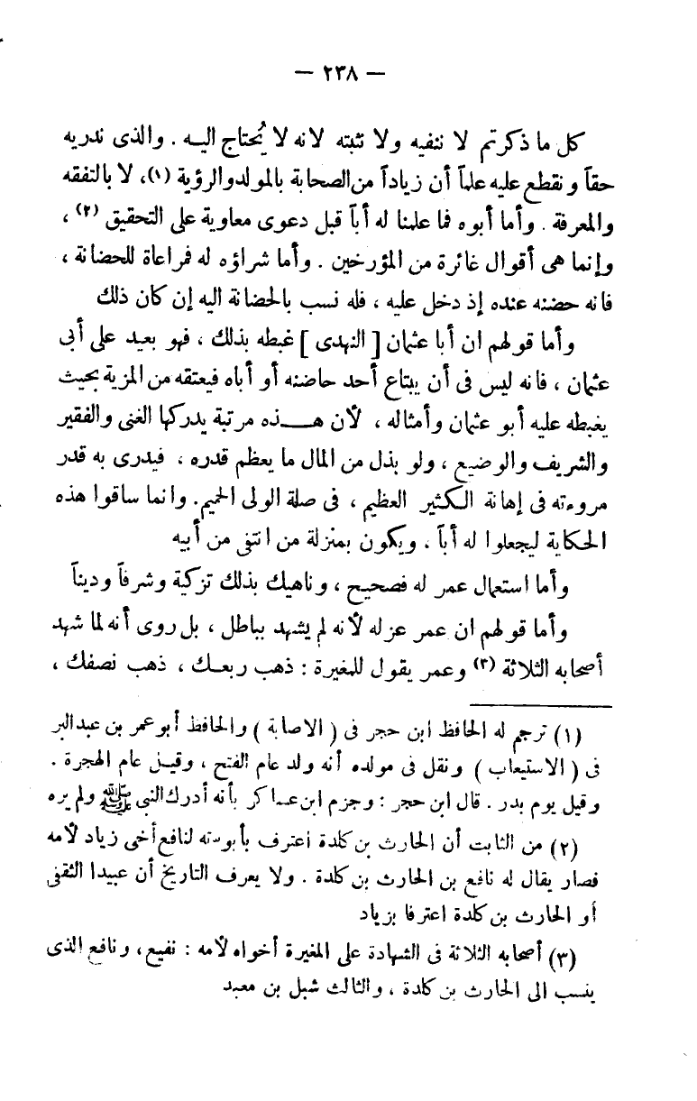كل ما ذكرتم لا ننفيه ولا نثبته لأنه لا يحتاج إليه. والذي ندريه حقاً ونقطع عليه علما أن زياداً من الصحابة بالمولد والرؤية (¬1) لا بالتفقه والمعرفة. وأما أبوه فما علمنا له أبا قبل دعوى معاوية على التحقيق (¬2) وإنما هي أقوال غائرة من المؤرخين. وأما شراؤه له فمراعاة للحضانة، فإنه حضنه عنده إذ دخل عليه، فله نسب بالحضانة إليه إن كان ذلك.