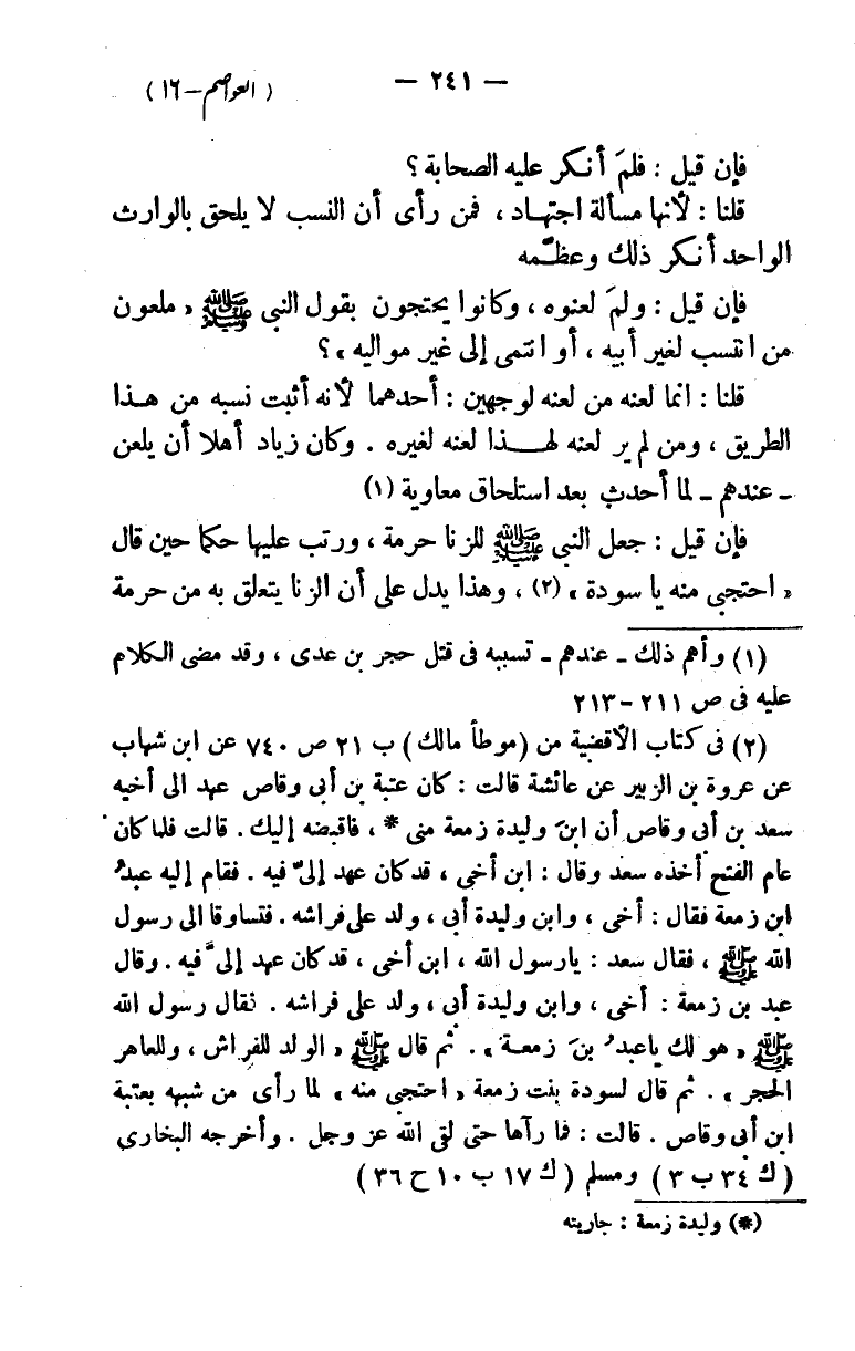 (¬2) في كتاب الأقضية من (موطأ مالك) ب21 ص740 عن ابن شهاب عن عروة بن الزبير عن عائشة قالت: كان عتبة بن أبي وقاص عهد إلى أخيه سعد بن أبي وقاص أن ابن وليدة زمعة مني [وليدة زمعة: جاريته.] ، فاقبضه إليك. قالت فلما كان عام الفتح أخذه سعد وقال: ابن أخي، قد كان عهد إلي فيه. فقام إليه عبد بن زمعة فقال: أخي، وابن وليدة أبي، ولد على فراشه. فتساوقا إلي رسول الله صلي الله عليه وسلم، فقال سعد: يا رسول الله، ابن أخي، قد كان عهد إلي فيه. وقال عبد بن زمعة: أخي، وابن وليدة أبي، ولد على فراشه. فقال رسول الله صلي الله عليه وسلم " هو لك يا عبد بن زمعة ". ثم قال صلي الله عليه وسلم " الولد للفراش، وللعاهر الحجر ". ثم قال لسودة بنت زمعة " احتجبي منه " لما رأى من شبهه بعتبة بن أبي وقاص. قالت: فما رآها حتى لقي الله عز وجل. وأخرجه البخاري (ك34 ب3) ومسلم (ك17 ب10 ح36) .