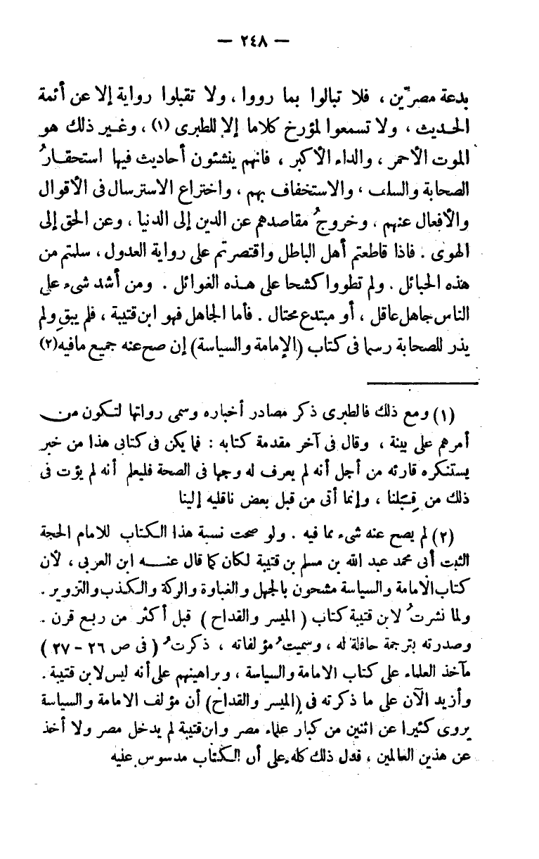 والمؤرخين، وأهل الآداب، بأنهم أهل جهالة بحرمات الدين، أو على بدعة مصرين، فلا تبالوا بما رووا، ولا تقبلوا رواية إلا عن أئمة الحديث، ولا تسمعوا لمؤرخ كلاماً إلا للطبري (¬1) وغير ذلك هو الموت الأحمر، والداء الأكبر. فإنهم ينشئون أحاديث فيها استحقار الصحابة والسلف، والاستخفاف بهم، واختراع الاسترسال في الأقوال والأفعال عنهم، وخروج مقاصدهم عن الدين إلى الدنيا، وعن الحق إلى الهوى. فإذا قاطعتم أهل الباطل واقتصرتم على رواية العدول، سلمتم من هذه الحبائل. ولم تطووا كشحا على هذه الغوائل ومن أشد شيء على الناس جاهل عاقل، أو مبتدع محتال. فأما الجاهل فهو ابن قتيبة، فلم يبق ولم يذر للصحابة رسما في كتاب (الإمامة والسياسة) إن صح عنه جميع ما فيه (¬2)