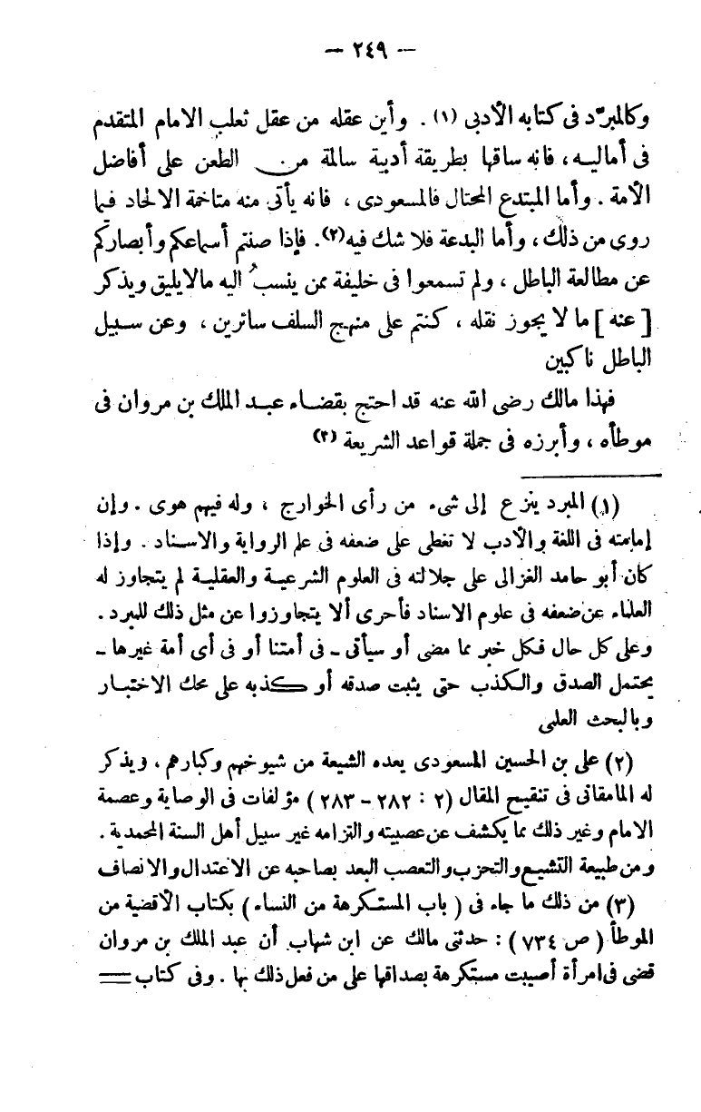 (¬2) علي بن الحسين المسعودي يعده الشيعة من شيوخهم وكبارهم، ويذكر له المامقاني في تنقيح المقال (2: 282 -283) مؤلفات في الوصاية وعصمة الإمام وغير ذلك مما يكشف عن عصبيته والتزامه غير سبيل أهل السنه المحمدية. ومن طبيعة التشيع والتحزب والتعصب البعد بصاحبه عن الاعتدال والإنصاف.
