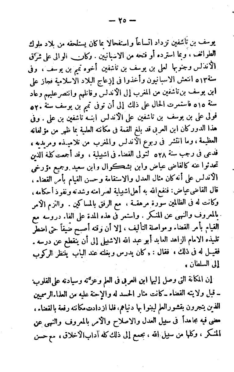 انتشر في ربوع الأندلس والمغرب من تلاميذه ومريديه، فدعي في رجب سنة 528 لتولي القضاء في إشبيلية. وقد أجمعت كلمة الذين تحدثوا عنه- كالقاضي عياض، وابن بشكوال، وابن سعيد وجميع مؤرخي الأندلس-على أنه كان مثال العدل والاستقامة وحسن القيام بأمر القضاء، قال القاضي عياض: فنفع الله به أهل إشبيلية لصرامته وشدته ونفوذ أحكامه، وكانت له في الظالمين سورة مرهقة، مع الرفق بالمساكين، والتزم الأمر بالمعروف والنهي عن المنكر. واستمر في هذه المدة على إلقاء دروسه مع القيام بأمر القضاء ومواصلة التأليف. إلا أن وقته أصبح ضيقا حتى اضطر تلميذه الإمام الزاهد العابد أبو عبد الله الإشبيلي إلى أن ينقطع عن درسه. فقيل له في ذلك، فقال: (كان يدرس وبغلته عند الباب ينتظر الركوب إلى السلطان) .