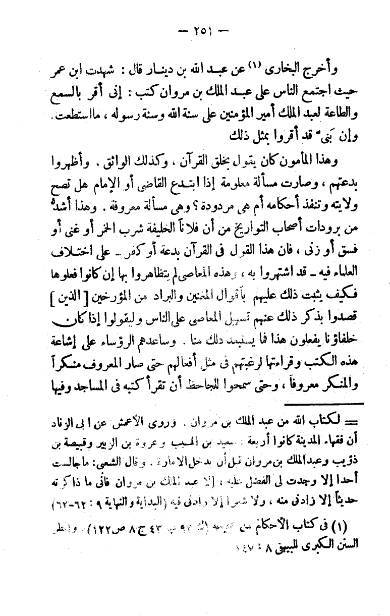 وهذا المأمون كان يقول بخلق القرآن، وكذلك الواثق، وأظهروا بدعتهم، وصارت مسألة معلومة إذا ابتدع القاضي أو الإمام هل تصح ولايته وتنفذ أحكامه أم هي مردودة؟ وهي مسألة معروفة. وهذا أشد من برودات أصحاب التواريخ من أن فلاناً الخليفة شرب الخمر أو غنى أو فسق أو زنى، فإن هذا القول في القرآن بدعة أو كفر - على اختلاف العلماء فيه - قد اشتهروا به، وهذه المعاصي لم يتظاهروا بها إن كانوا فعلوها، فكيف يثبت ذلك عليهم بأقوال المغنين والبراد من المؤرخين [الذين] قصدوا بذكر ذلك عنهم تسهيل المعاصي على الناس وليقولوا إذا كان خلفاؤنا يفعلون هذا فما يستبعد ذلك منا. وساعدهم الرؤساء على إشاعة هذه الكتب وقراءتها لرغبتهم في مثل أفعالهم حتى صار المعروف منكراً والمنكر معروفاً، وحتى سمحوا للجاحظ أن