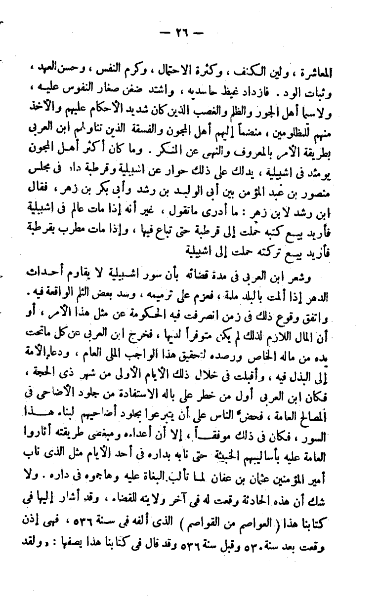 وشعر ابن العربي في مدة قضائه بأن سور إشبيلية لا يقاوم أحداث الدهر إذا ألمت بالبلد ملمة، فعزم على ترميمه، وسد بعض الثلم الواقعة فيه. واتفق وقوع ذلك في زمن انصرفت فيه الحكومة عن مثل هذا الأمر. أو أن المال اللازم لذلك لم يكن متوافرا لديها، فخرج ابن العربي عن كل ما تحت يده من ماله الخاص ورصده لتحقيق هذا الواجب الملي العام، ودعا الأمة إلى البذل فيه، وأقبلت في خلال ذلك الأيام الأولى من شهر ذي الحجة، فكان ابن العربي أول من خطر على باله الاستفادة من جلود الأضاحي في المصالح العامة، فحض الناس على أن يتبرعوا بجلود أضاحيهم لبناء هذا السور، فكان في ذلك موفقا، إلا أن أعداءه ومبغضي طريقته أثاروا العامة عليه بأساليبهم الخبيثة حتى نابه بداره في أحد الأيام مثل الذي ناب أمير المؤمنين عثمان بن عفان لما تألب البغاة عليه وهاجموه في داره. ولا شك أن هذه الحادثة وقعت له في آخر ولايته للقضاء، وقد أشار إليها في كتابنا هذا (العواصم من القواصم) الذي ألفه في سنة 536 فهي إذن وقعت بعد سنة 530 وقبل سنة 536 وقد قال في كتابنا هذا ص137-138 يصفها (ولقد حكمت بين الناس فألزمتهم الصلاة، والأمر بالمعروف والنهي عن المنكر حتى لم يك في الأرض منكر. واشتد الخطب على أهل الغصب، وعظم على الفسقة الكرب فتألبوا وألبوا وثاروا إلي، فاستسلمت لأمر الله، وأمرت كل من حولي ألا يدفعوا عن داري، وخرجت على السطوح بنفسي فعاثوا علي، ولولا ما سبق من حسن المقدار، لكنت قتيل الدار. وكان الذي حملني على ذلك ثلاثة أمور: أحدها وصاية النبي صلى الله عليه وسلم (أي بالكف عن القتال في الفتنة) . الثاني الاقتداء بعثمان. والثالث سوء الأحدوثة التي فر منها رسول الله صلى الله عليه وسلم المؤيد بالوحي (¬1) .