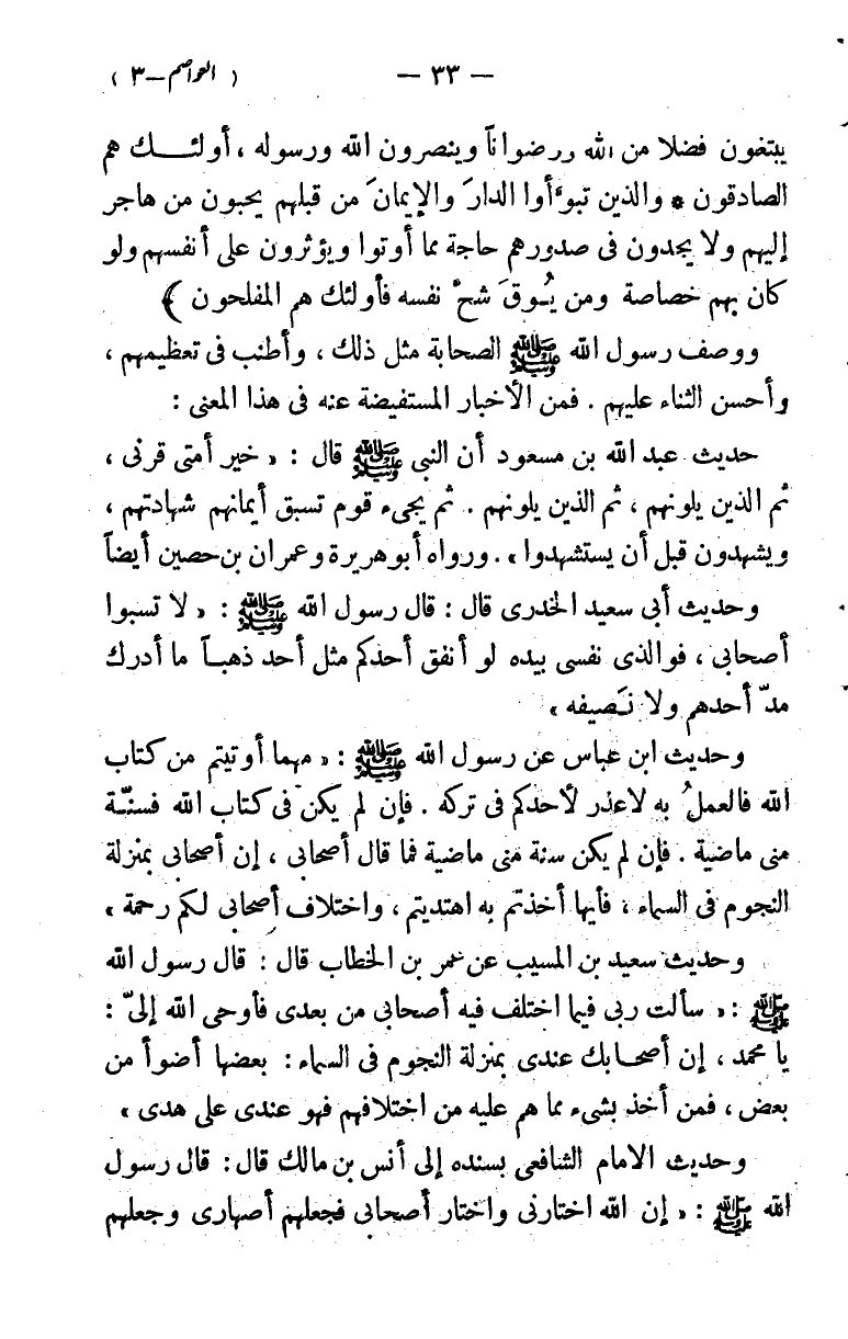 وحديث الإمام الشافعي بسنده إلى أنس بن مالك قال: قال رسول الله صلى الله عليه وسلم: «إن الله اختارني واختار أصحابي فجعلهم أصهاري وجعلهم أنصاري. وإنه سيجيء في آخر الزمان قوم ينتقصونهم، ألا فلا