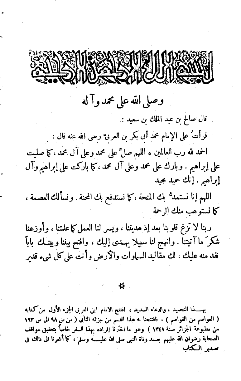 (¬1) بهذا التحميد والدعاء السديد، افتتح الإمام ابن العربي الجزء الأول من كتابه (العواصم من القواصم) . فافتتحنا به هذا القسم من جزئه الثاني (من ص 98 إلى ص 193 من مطبوعة الجزائر سنة 1347) وهو ما اخترنا إفراده بهذا السفر خاصا بتحقيق مواقف الصحابة رضوان الله عليهم بعد وفاة النبي صلى الله عليه وسلم، كما أشرنا إلى ذلك في تصدير الكتاب.