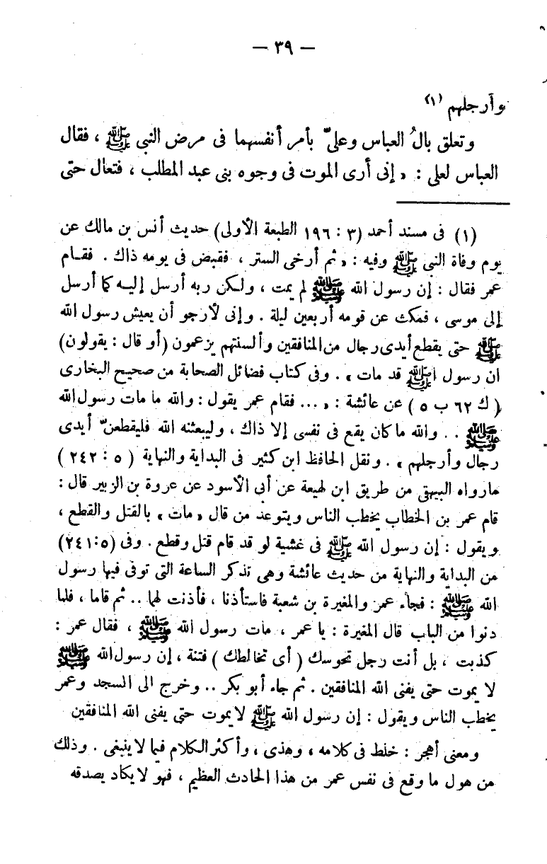 (¬1) في مسند أحمد (3: 196 الطبعة الأولى) حديث أنس بن مالك عن يوم وفاة النبي صلى الله عليه وسلم وفيه: " ثم أرخى الستر، فقبض في يومه ذاك. فقام عمر فقال: إن رسول الله صلى الله عليه وسلم لم يمت، ولكن ربه أرسل إليه كما أرسل إلى موسى، فمكث عن قومه أربعين ليلة. وإني لأرجو أن يعيش رسول الله صلى الله عليه وسلم حتى يقطع أيدي رجال من المنافقين وألسنتهم يزعمون (أو قال: يقولون) إن رسول الله صلى الله عليه وسلم قد مات ". وفي كتاب فضائل الصحابة من صحيح البخاري (ك 62 ب 5) عن عائشة: (. . . فقام عمر يقول: والله ما مات رسول الله صلى الله عليه وسلم. . . والله ما كان يقع في نفسي إلا ذاك، وليبعثنه الله فليقطعن أيدي رجال وأرجلهم) . ونقل الحافظ ابن كثير في البداية والنهاية (5-242) ما رواه البيهقي من طريق ابن لهيعة عن أبي الأسود عن عروة بن الزبير قال: قام عمر بن الخطاب يخطب الناس ويتوعد من قال " مات " بالقتل والقطع، ويقول: إن رسول الله صلى الله عليه وسلم في غشية لو قد قام قتل وقطع. وفي (5: 241) من البداية والنهاية من حديث عائشة وهي تذكر الساعة التي توفي فيها رسول الله صلى الله عليه وسلم: فجاء عمر والمغيرة بن شعبة فاستأذنا فأذنت لهما. . ثم قاما، فلما دنوا من الباب قال المغيرة: يا عمر، مات رسول الله صلى الله عليه وسلم. فقال عمر: كذبت، بل أنت رجل تحوسك (أي تخالطك) فتنة، إن رسول الله صلى الله عليه وسلم لا يموت حتى يفني الله المنافقين. ثم جاء أبو بكر. . . وخرج إلى المسجد وعمر يخطب الناس ويقول: إن رسول الله صلى الله عليه وسلم لا يموت حتى يفني الله المنافقين.