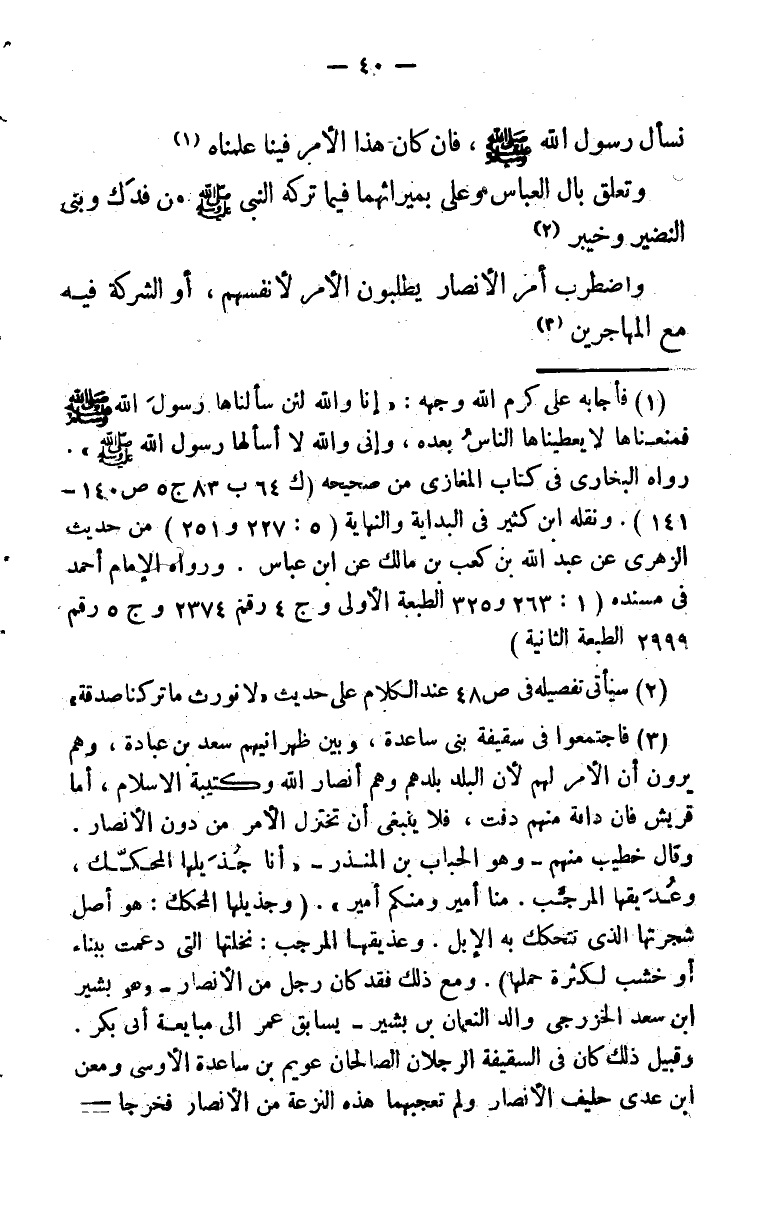 (¬1) فأجابه علي كرم الله وجهه: (إنا والله لئن سألناها رسول الله صلى الله عليه وسلم فمنعناها لا يعطيناها الناس بعده، وإني والله لا أسألها رسول الله صلى الله عليه وسلم" رواه البخاري في كتاب المغازي من صحيحه (ك 64 ب 83 ج 5 ص 140 - 141) . ونقله ابن كثير في البداية والنهاية (5: 227 و251) من حديث الزهري عن عبد الله بن كعب بن مالك عن ابن عباس. ورواه الإمام أحمد في مسنده (1: 263 و325 الطبعة الأولى وج 4 رقم 2374 وج5 رقم 2999 الطبعة الثانية) .