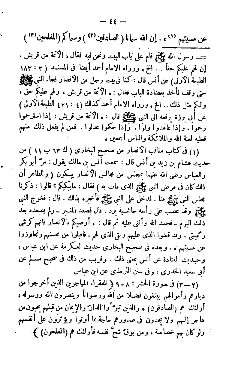 (¬1) في كتاب مناقب الأنصار من صحيح البخاري (ك 63 ب 11) من حديث هشام بن زيد بن أنس قال: سمعت أنس بن مالك يقول: مر أبو بكر والعباس رضي الله عنهما بمجلس من مجالس الأنصار يبكون (والظاهر أن ذلك كان في مرض النبي صلى الله عليه وسلم الذي مات به) فقال: ما يبكيكم؟ قالوا: ذكرنا مجلس النبي صلى الله عليه وسلم فدخل على النبي صلى الله عليه وسلم فأخبره بذلك. قال: فخرج النبي صلى الله عليه وسلم وقد عصب على رأسه حاشية برد. قال فصعد المنبر - ولم يصعده بعد ذلك اليوم - فحمد الله وأسنى عليه ثم قال: " أوصيكم بالأنصار فإنهم كرشي وعيبتي، وقد قضوا الذي عليهم وبقى الذي لهم، فاقبلوا من محسنهم وتجاوزوا عن مسيئهم ". وبعده في صحيح البخاري حديث لعكرمة عن ابن عباس، وحديث لقتادة عن أنس بمعنى ذلك.