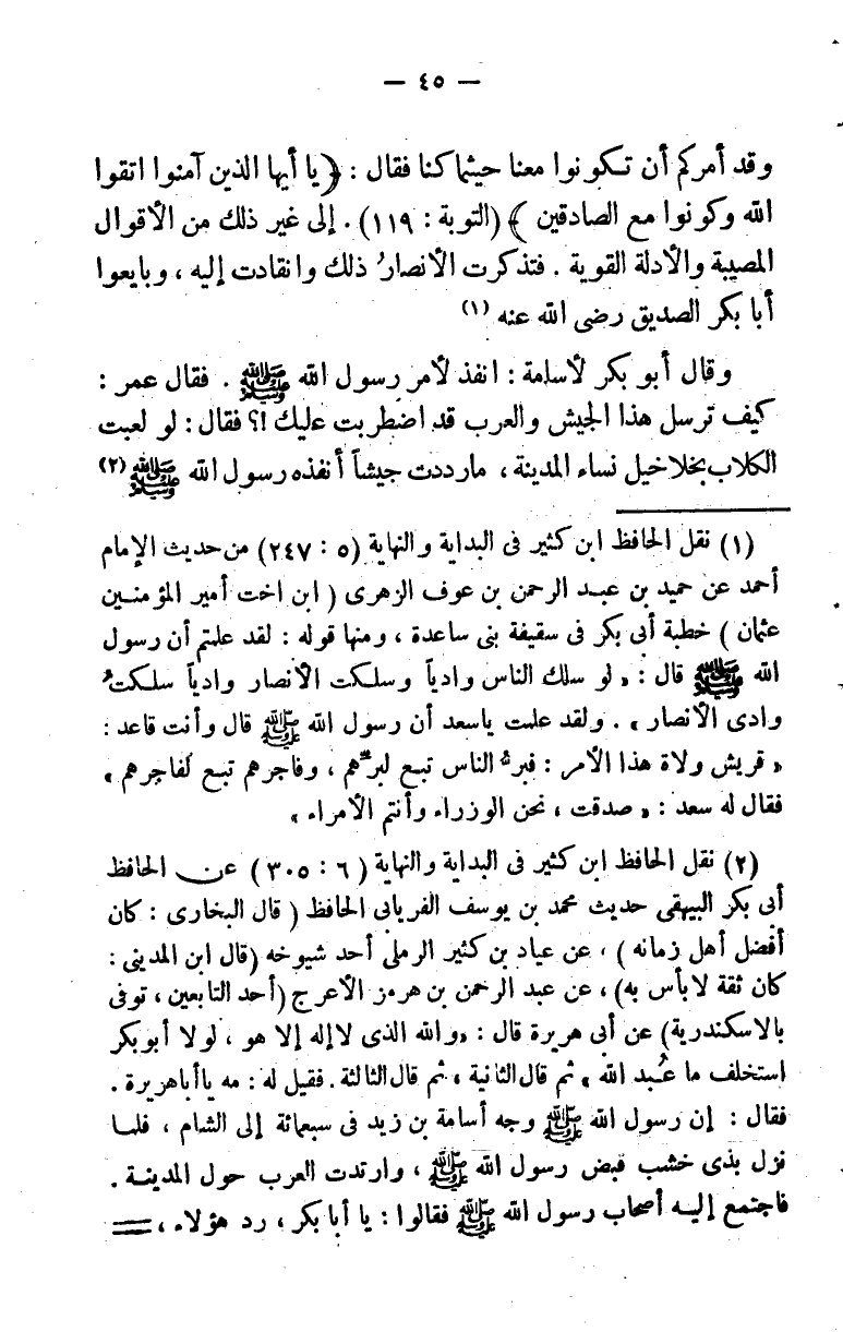 (¬2) نقل الحافظ ابن كثير في البداية والنهاية (6: 305) عن الحافظ أبي بكر البيهقي حديث محمد بن يوسف الفريابي الحافظ (قال البخاري: كان أفضل أهل زمانه) ، عن عياد بن كثير الرملي أحد شيوخه (قال ابن المديني: كان ثقة لا بأس به) عن عبد الرحمن بن هرمز الأعرج (أحد التابعين، توفي بالإسكندرية) عن أبي هريرة قال: " والله الذي لا إله إلا هو، لولا أبو بكر استخلف ما عبد الله " ثم قال الثانية، ثم قال الثالثة. فقيل له: مه يا أبا هريرة. فقال: إن رسول الله صلى الله عليه وسلم وجه إسامة بن زيد في سبعمائة إلى الشام، فلما نزل بذي خشب قبض رسول الله صلى الله عليه وسلم، وارتدت العرب حول المدينة. فاجتمع إليه أصحاب رسول الله صلى الله عليه وسلم فقالوا: يا أبا بكر، رد هؤلاء، توجه هؤلاء إلى الروم وقد ارتدت العرب حول المدينة؟ ! فقال: " والذي لا إله غيره، لو جرت الكلاب بأرجل أزواج رسول الله صلى الله عليه وسلم ما رددت جيشا وجهه رسول الله، ولا حللت لواء عقده رسول الله ". فوجه إسامة، فجعل لا يمر بقبيل يريدون الارتداد إلا قالوا: لولا أن لهؤلاء قوة ما خرج مثل هؤلاء من عندهم، ولكن ندعهم حتى يلقوا الروم، فلقوا الروم فهزموهم وقتلوهم ورجعوا سالمين فثبتوا على الإسلام.