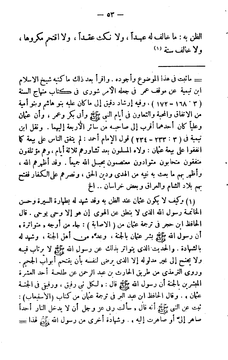 (¬1) وكيف لا يكون عثمان عند الظن به وقد شهد له بطهارة السيرة وحسن الخاتمة رسول الله صلى الله عليه وسلم الذي لا ينطق عن الهوى إن هو إلا وحي يوحي. قال الحافظ ابن حجر في ترجمة عثمان من (الإصابة) : جاء من أوجه متواترة أن رسول الله صلى الله عليه وسلم بشر عثمان بالجنة، وعده من أهل الجنة، وشهد له بالشهادة. والحديث الذي يتواتر بذلك عن رسول الله صلى الله عليه وسلم لا يرتاب فيه ولا يجنح إلى غير مدلوله إلا الذي يرضى لنفسه بأن يقتحم أبواب الجحيم. وروى الترمذي من طريق الحارث بن عبد الرحمن، عن طلحة أحد العشرة المبشرين بالجنة، أن رسول الله صلى الله عليه وسلم قال: " لكل نبي رفيق، ورفيقي بالجنة عثمان ".