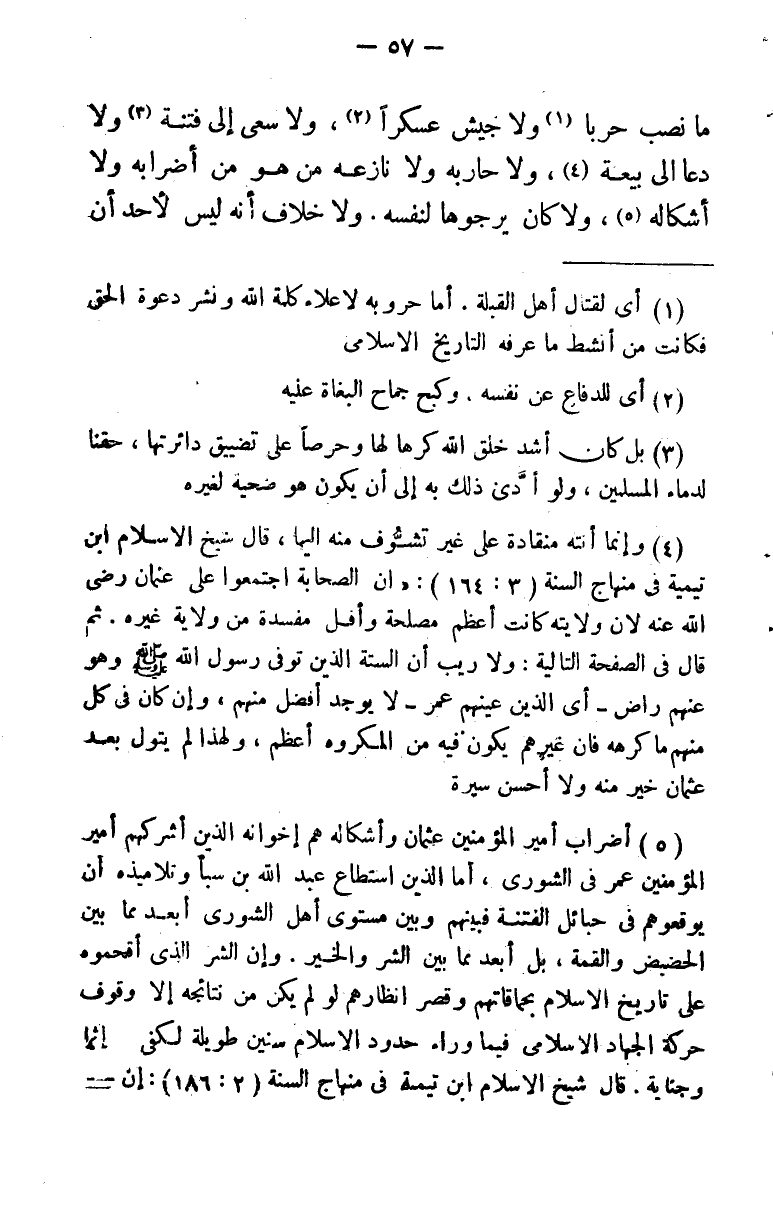 (¬5) أضراب أمير المؤمنين عثمان وأشكاله هم إخوانه الذين أشركهم أمير المؤمنين عمر في الشورى، أما الذين استطاع عبد الله بن سبأ وتلاميذه أن يوقعوهم في حبائل الفتنة فبينهم وبين مستوى أهل الشورى أبعد مما بين الحضيض والقمة، بل أبعد مما بين الشر والخير. وإن الشر الذي أقحموه على تاريخ الإسلام بحماقاتهم وقصر أنظارهم لو لم يكن من نتائجه إلا وقوف حركة الجهاد الإسلامي فيما وراء حدود الإسلام سنين طويلة لكفى به إثما وجناية. قال شيخ الإسلام ابن تيمية في منهاج السنة (2: 186) : إن خيار المسلمين لم يدخل واحد منهم في دم عثمان. لا قتل، ولا أمر بقتله، وإنما قتله طائفة من المفسدين في الأرض من أوباش القبائل وأهل الفتن. وكان علي رضي الله عنه يقول " اللهم العن قتلة عثمان في البر والبحر والسهل والجبل ".