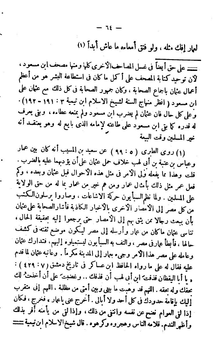 (¬1) روى الطبري (5: 99) عن سعيد بن المسيب أنه كان بين عمار وعباس بن عتبة بن أبي لهب خلاف حمل عثمان على أن يؤدبهما عليه بالضرب. قلت: وهذا مما يفعله ولي الأمر في مثل هذه الأحوال قبل عثمان وبعده، وكم فعل عمر مثل ذلك بأمثال عمار ومن هم خير من عمار بما له من حق الولاية على المسلمين. ولما نظم السبئيون حركة الإشاعات، وصاروا يرسلون الكتب من كل مصر إلى الأمصار الأخرى بالأخبار الكاذبة فأشار الصحابة على عثمان بأن يبعث رجالا ممن يثق بهم إلى الأمصار حتى يرجعوا إليه بحقيقة الحال، تناسى عثمان ما كان من عمار، وأرسله إلى مصر ليكون موضع ثقته في كشف حالها. فأبطأ عمار في مصر، والتف به السبئيون ليستميلوه إليهم، فتدارك عثمان وعامله على مصر هذا الأمر، وجيء بعمار إلى المدينة مكرما. وعاتبه لما قدم عليه فقال له - على ما رواه الحافظ ابن عساكر في تاريخ دمشق (7: 429) -: " يا أبا اليقظان قذفت ابن أبي لهب أن قذفك. . . وغضبت علي أن أخذت لك بحقك وله بحقه. اللهم قد وهبت ما بيني وبين أمتي من مظلمة، اللهم إني متقرب إليك بإقامة حدودك في كل أحد ولا أبالي. اخرج عني يا عمار " فخرج، فكان إذا لقي العوام نضح عن نفسه وانتفى من ذلك، وإذا لقي من يأمنه بذلك أظهر الندم، فلامه الناس وهجروه وكرهوه. قال شيخ الإسلام ابن تيمية في منهاج السنة (3: 192 - 193) : وعثمان أفضل من كل من تكلم فيه، هو أفضل من ابن مسعود، وعمار، وأبي ذر، ومن غيرهم من وجوه كثيرة كما ثبت ذلك بالدلائل، فليس جعل كلام المفضول قادحا في الفاضل بأولى من العكس. وكذلك ما نقل من تكلم عمار في عثمان، وقول الحسن فيه (أي في عمار) . نقل أن عمارا قال: لقد كفر عثمان كفرة صلعاء. فأنكر الحسن بن علي ذلك عليه، وكذلك علي وقال له: يا عمار، أتكفر برب آمن به عثمان؟ قال ابن تيمية: وقد تبين من ذلك أن الرجل المؤمن الذي هو ولي لله قد يعتقد كفر الرجل المؤمن الذي هو ولي لله، ويكون مخطئا في هذا الاعتقاد ولا يقدح هذا في إيمان واحد منهما وولايته. كما ثبت في الصحيح أن أسيد بن حضير قال لسعد بن عبادة بحضرة النبي صلى الله عليه وسلم: إنك منافق تجادل عن المنافقين. وكما قال عمر بن الخطاب لحاطب بن أبي بلتعة: دعني يا رسول الله أضرب عنق هذا المنافق. فقال صلى الله عليه وسلم: " إنه قد شهد بدرا، وما يدريك لعل الله اطلع على أهل بدر فقال: اعملوا ما شئتم فقد غفرت لكم ". فعمر أفضل من عمار، وعثمان أفضل من حاطب بن أبي بلتعة بدرجات كثيرة، وحجة عمر فيما قال لحاطب أظهر من حجة عمار، ومع هذا فكلاهما من أهل الجنة، فكيف لا يكون عثمان وعمار من أهل الجنة وإن قال أحدهما للآخر ما قال؟ مع أن طائفة من العلماء أنكروا أن يكون عمار قال ذلك. . . ثم قال شيخ الإسلام: وفي الجملة، فإذا قيل إن عثمان ضرب ابن مسعود أو عمارا فهذا لا يقدح في أحد منهم. فإنا نشهد أن الثلاثة في الجنة، وأنهم من أكابر أولياء الله المتقين. وإن ولي الله قد يصدر عنه ما يستحق عليه العقوبة الشرعية، فكيف بالتعزير. وقد ضرب عمر بن الخطاب أبيّ بن كعب بالدرة لما رأى الناس يمشون خلفه وقال: " هذا ذلة للتابع وفتنة للمتبوع " فإن كان عثمان أدب هؤلاء. فإما أن يكون عثمان مصيبا في تعزيرهم لاستحقاقهم ذلك، ويكون ذلك الذي عزروا عليه تابوا منه وكفر عنهم بالتعزير وغيره من المصائب أو بحسناتهم العظيمة أو بغير ذلك. وإما أن يقال كانوا مظلومين مطلقا. فالقول في عثمان كالقول فيهم وزيادة، فإنه أفضل منهم، وأحق بالمغفرة والرحمة. . . . إلخ.