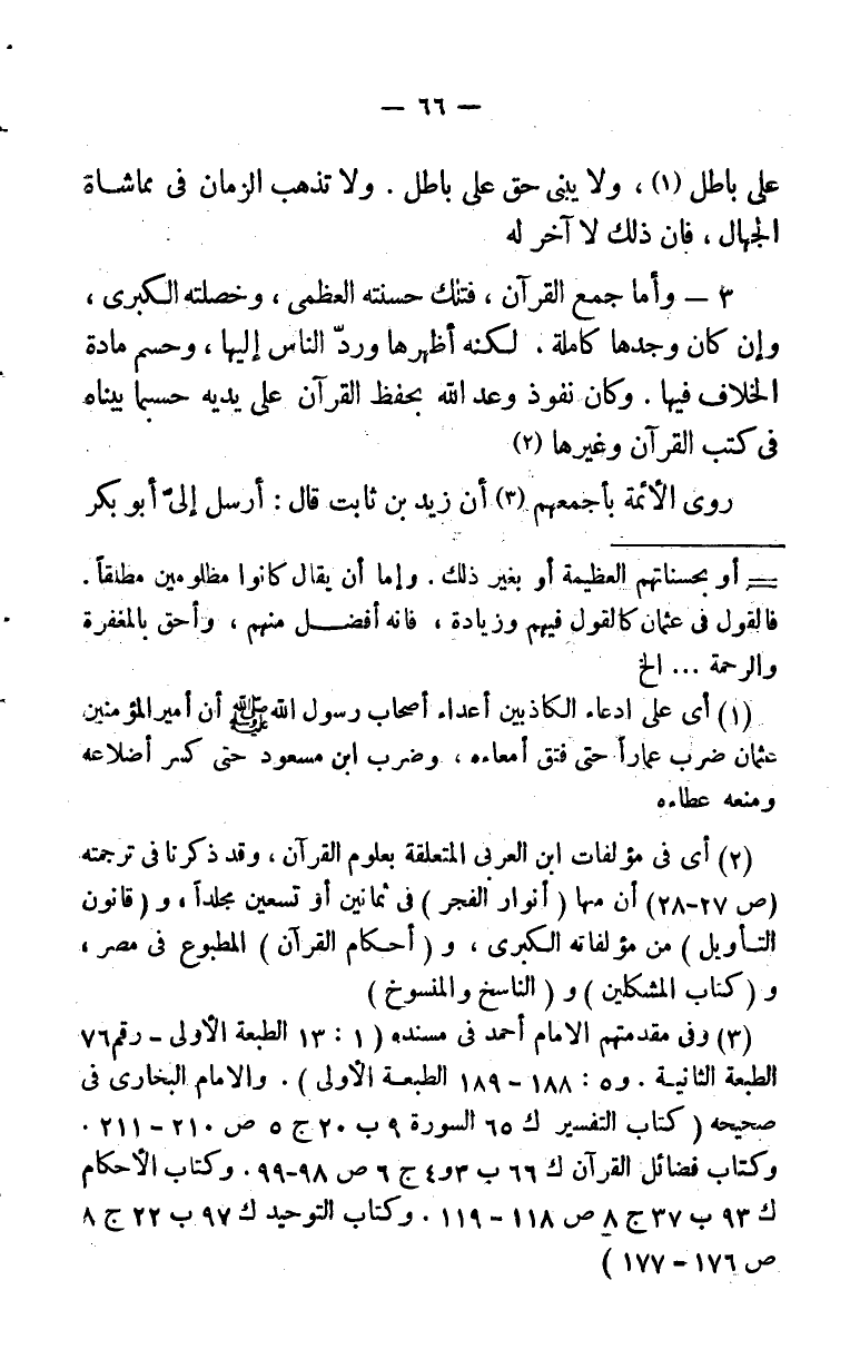 3 - وأما جمع القرآن، فتلك حسنته العظمى، وخصْلتُه الكبرى، وإن كان وَجدها كاملة، لكنه أظهرها وردَّ الناس إليها، وحسم مادة الخلاف فيها. وكان نفوذُ وعد الله بحفظ القرآن على يديه حسبما بيناه في كتب القرآن وغيرها (¬2) .