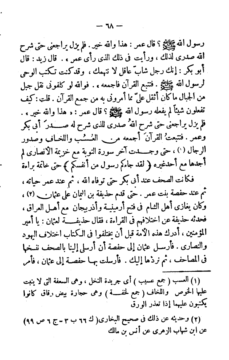 (¬1) العسب (جمع عسيب) أي جريدة النخل، وهي السعفة التي لا ينبت عليها الخوص. واللخاف (جمع لخفة) وهي حجارة بيض رقاق. كانوا يكتبون عليها إذا تعذر الورق.