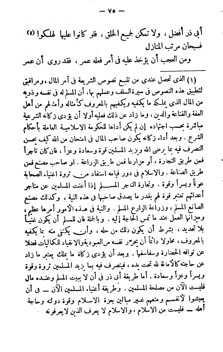 (¬1) الذي تحصل عندي من تتبع نصوص الشريعة في أمر المال، ومراقبتي لتطبيق هذه النصوص في سيرة السلف وعملهم بها، أن المسلم له في نفسه وذويه من المال الذي يملكه ما يكفيه ويكفيهم بالمعروف كأمثاله وأمثالهم من أهل العفة والقناعة والدين، وما زاد عن ذلك فعليه أولا أن يؤدي زكاته الشرعية مباشرة بحسب اجتهاده إن لم يكن أداها للحكومة الإسلامية العاملة بأحكام الشرع وبعد أداء زكاته يكون صاحب المال في امتحان من الله كيف يحسن التصرف فيه بما يرضي الله ويزيد المسلمين قوة وسعادة وعزا، فإن كان تاجرا فمن طريق التجارة أو مزارعا فمن طريق الزراعة، أو صاحب مصنع فمن طريق الصناعة. والإسلام في دور قيامه استفاد من ثروة أغنياء الصحابة عونا ويسرا وقوة. وتجارة التاجر المسلم إذا أغنت المسلمين عن متاجر أعدائهم تعتبر قوة لهم بقدر ما يصدق صاحبها في هذه النية، وكذلك مصنع الصانع المسلم، وزراعة الزارع المسلم. والنية في هذه الأمور أمرها عظيم، وميزانها العمل عندما تمس الحاجة إليه. وبالجملة فإن للمسلم أن يكون غنيا بلا تحديد. بشرط أن يكون ذلك من حله، وأن يكتفي منه بما يكفيه بالمعروف، محاولا دائما أن يحرر نفسه من العبودية والانقياد للكماليات فضلا عن توافه الحضارة وسفاسفها. وبعد أن يؤدي زكاة ما يملك يعتبر ما زاد عن حاجته كالأمانة لله تحت يده. فيتصرف فيها بما يزيد المسلمين ثروة وقوة ويسرا وعزا وسعادة، أما طريقة أبي ذر في أن لا يبيت المسلم وعنده مال فليست الآن من مصلحة المسلمين، وطريقة أغنياء المسلمين الآن - في أن يعيشوا لأنفسهم ومتعهم غير مبالين بعزة الإسلام وقوة دولته وحاجة أهله - فليست من الإسلام، والإسلام لا يعرف الذين لا يعرفونه. انظر مقالتنا (المال في نظام الإسلام) في أول جزء شوال 1374 من مجلة الأزهر.