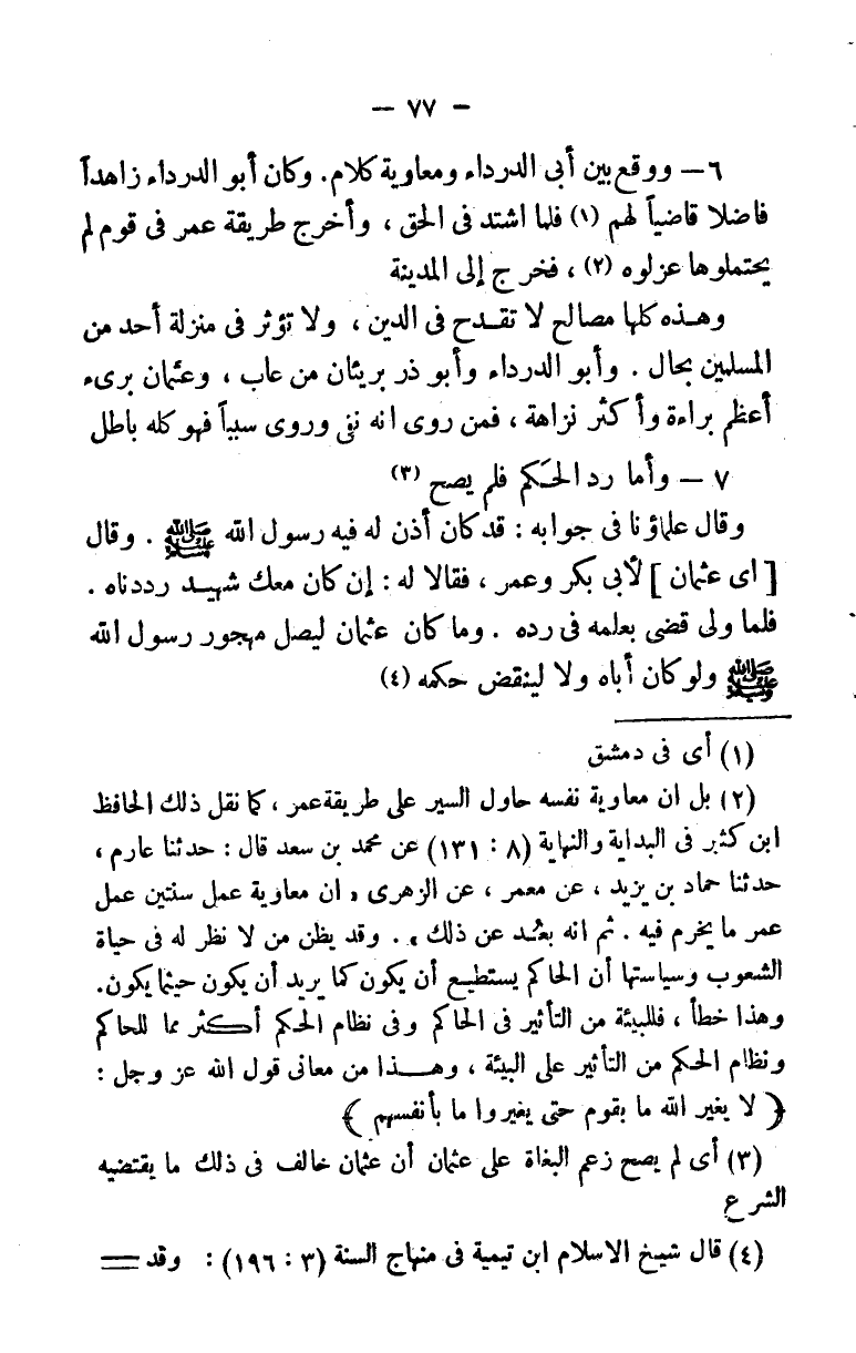 (¬4) قال شيخ الإسلام ابن تيمية في منهاج السنة (3: 196) : " وقد طعن كثير من أهل العلم في نفيه (أي في نفي النبي صلى الله عليه وسلم الحكم) وقالوا: " ذهب باختياره. وقصة نفي الحكم ليست في الصحاح، ولا لها إسناد يعرف به أمرها " ثم قال: " لم تكن الطلقاء تسكن بالمدينة، فإن كان طرده فإنما طرده من مكة لا من المدينة، ولو طرده من المدينة لكان يرسله إلى مكة. وقد طعن كثير من أهل العلم في نفيه كما تقدم وقالوا: هو ذهب باختياره. . . وإذا كان النبي صلى الله عليه وسلم قد عزر رجلا بالنفي لم يلزم أن يبقى منفيا طول الزمان، فإن هذا لا يعرف في شيء من الذنوب، ولم تأت الشريعة بذنب يبقى صاحبه منفيا دائما. . . وقد كان عثمان شفع في عبد الله بن سعد بن أبي سرح فقبل صلى الله عليه وسلم شفاعته فيه وبايعه، فكيف لا يقبل شفاعته في الحكم، وقد رووا أن عثمان سأله أن يرده فأذن له في ذلك. ونحن نعلم أن ذنبه دون ذنب عبد الله بن سعد بن أبي سرح. وقصة عبد الله ثابتة معروفة بالإسناد، وأما قصة الحكم فإنما ذكرت مرسلة، وقد ذكرها المؤرخون الذين يكثر الكذب فيما يروونه، فلم يكن هناك نقل ثابت يوجب القدح فيمن هو دون عثمان. والمعلوم من فضائل عثمان ومحبة النبي صلى الله عليه وسلم له وثنائه عليه وتخصيصه بابنتيه وشهادته له بالجنة وإرساله إلى مكة ومبايعته له عنه وتقديم الصحابة له في الخلافة وشهادة عمر وغيره له بأن رسول الله صلى الله عليه وسلم مات وهو عنه راض وأمثال ذلك مما يوجب العلم القطعي بأنه من كبار أولياء الله المتقين الذين رضي الله عنهم ورضوا عنه. فلا يدفع هذا بنقل لا يثبت إسناده ولا يعرف كيف وقع ويجعل لعثمان ذنب بأمر لا تعرف حقيقته. . . إلخ " وانظر أيضا 3: 235 - 236 من منهاج السنة. ونقل الإمام أبو محمد بن حزم في كتاب (الإمامة والمفاضلة) المدرج في الجزء الرابع من كتابه " الفِصَل " ص 154 قول من احتج لعثمان على من أنكروا ذلك عليه: " ونفي رسول الله صلى الله عليه وسلم لم يكن حدا واجبا، ولا شريعة على التأبيد، وإنما كان عقوبة على ذنب استحق به النفي، والتوبة مبسوطة، فإذا تاب سقطت عنه تلك العقوبة بلا خلاف من أحد من أهل الإسلام، وصارت الأرض كلها مباحة ". ونقل مجتهد الزيدية السيد محمد بن إبراهيم الوزير اليمني (المتوفى سنة 840) في كتابه الروض الباسم في الذب عن سنة أبي القاسم (1: 141 - 142) قول الحاكم المحسن بن كرامة المعتزلي المتشيع في كتابه سرح العيون أن رسول الله صلى الله عليه وسلم أذن في ذلك لعثمان. قال ابن الوزير: إن المعتزلة والشيعة من الزيدية يلزمهم قبول هذا الحديث وترك الاعتراض على عثمان بذلك، لأن راوي الحديث عندهم من المشاهير بالثقة والعلم وصحة العقيدة. ثم بسط ابن الوزير الكلام على هذا الموضوع بحجج واستدلالات - استغرقت ثلاث صفحات - دفاعا عن أمير المؤمنين عثمان في رده الحكم. وهذه الحجج من أئمة الزيدية ومجتهديهم - بعد روايته ذلك الحديث عن الإمام المعتزلي المتشيع - لها دلالتها الخاصة، مع الذي سمعته من إمامي أهل السنة شيخ الإسلام ابن تيمية والقاضي ابن العربي، ومن إمام أهل الظاهر أبي محمد بن حزم.