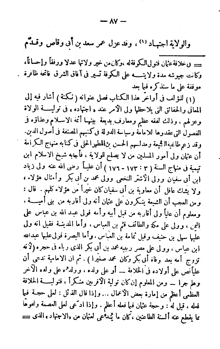 (¬1) للمؤلف في أواخر هذا الكتاب ص 243 فصل عنوانه (نكتة) أشار فيه إلى المعاني والحقائق التي يلاحظها ولي الأمر عند " اجتهاده " في تولية الولاة وعزلهم، وذلك لفقه عظيم ومعارف بديعة بينها أئمة الإسلام وعلماؤه في الفصول التي عقدوها للإمامة وسياسة الدولة وفي كتبهم المصنفة في أصول الدين. وقد زعم طاغية الشيعة ومدلسهم الحسن بن المطهر الحلي في كتابه منهاج الكرامة أن عثمان ولى أمور المسلمين من لا يصلح للولاية، فأجابه شيخ الإسلام ابن تيمية في (منهاج السنة 3: 173 - 176 والمنتقى منه للذهبي 382 - 383) أن عليا - رضي الله عنه - ولى زياد بن أبي سفيان وولى الأشتر النخعي وولى محمد بن أبي بكر وأمثال هؤلاء، ولا يشك عاقل أن معاوية بن أبي سفيان كان خيرا من هؤلاء كلهم. قال: ومن العجب أن الشيعة ينكرون على عثمان أنه ولى أقاربه من بني أمية، ومعلوم أن عليا ولى أقاربه من قبل أبيه وأمه، فولى عبيد الله بن عباس على اليمن، وولى على مكة والطائف قثم بن العباس، وأما المدينة فقيل إنه ولى عليها سهل بن حنيف وقيل ثمامة بن العباس، وأما البصرة فولى عليها عبد الله بن عباس، وولى على مصر ربيبه محمد بن أبي بكر الذي رباه في حجره (لأنه تزوج أمه بعد وفاة أبي بكر وكان محمد صغيرا) . ثم إن الإمامية تدعي أن عليا نص على أولاده في الخلافة - أو على ولده، وولده على ولده الآخر وهلم جرا - ومن المعلوم إن كان تولية الأقربين منكرا، فتولية الخلافة العظمى أولى من إمارة بعض الأعمال. . . وإذا قال القائل: لعليّ حجة فيما فعله، قيل له: وحجة عثمان فيما فعله أعظم. وإذا ادعى لعلي العصمة ونحوها مما يقطع عنه ألسنة الطاعنين، كان ما يدعى لعثمان من " الاجتهاد " الذي يقطع ألسنة الطاعنين أقرب إلى المعقول والمنقول. . . ثم قال: إن بني أمية كان رسول الله صلى الله عليه وسلم يستعملهم في حياته، واستعملهم بعده من لا يتهم بقرابة فيهم: أبو بكر وعمر، ولا تعرف قبيلة من قبائل قريش فيها عمال لرسول الله صلى الله عليه وسلم أكثر من بني عبد شمس، لأنهم كانوا كثيرين، وكان فيهم شرف وسؤدد، فاستعمل النبي صلى الله عليه وسلم في عزة الإسلام على أفضل الأرض مكة عتاب بن أسيد بن أبي العاص بن أمية، واستعمل على نجران أبا سفيان بن حرب بن أمية، واستعمل خالد بن سعيد بن العاص على صدقات بني مذحج وعلى صنعاء واليمن حتى مات رسول الله صلى الله عليه وسلم، واستعمل عثمان بن سعيد بن العاص على تيماء وخيبر وقرى عرينة، واستعمل أبان بن سعيد بن العاص على بعض السرايا ثم استعمله على البحرين فلم يزل عليها بعد العلاء الحضرمي (حليف بني أمية) حتى توفي النبي صلى الله عليه وسلم، فيقول عثمان: أنا لم أستعمل إلا من استعمله النبي صلى الله عليه وسلم ومن جنسهم ومن قبيلتهم، وكذلك أبو بكر وعمر بعده. . . فكان الاحتجاج على جواز الاستعمال من بني أمية بالنص الثابت عن النبي صلى الله عليه وسلم أظهر عند كل عاقل من دعوى كون الخلافة في واحد معين من بني هاشم بالنص، لأن هذا كذب باتفاق أهل العلم بالنقل، وذلك صدق باتفاق أهل العلم بالنقل (وانظر أيضا منهاج السنة 3: 236 - 237) . والذي يستعرض حياة عمال عثمان وجهادهم وفضائلهم يراهم في الذروة العليا من رجال الدولة، ولا يتردد في أنهم من بناة الأساس الأقوم من مجد الإسلام الإداري والعسكري، ولهم ثواب نتائجه في الفتوح وانتشار دعوة الإسلام بما يعده التاريخ من معجزاته الخارقة للعادات.