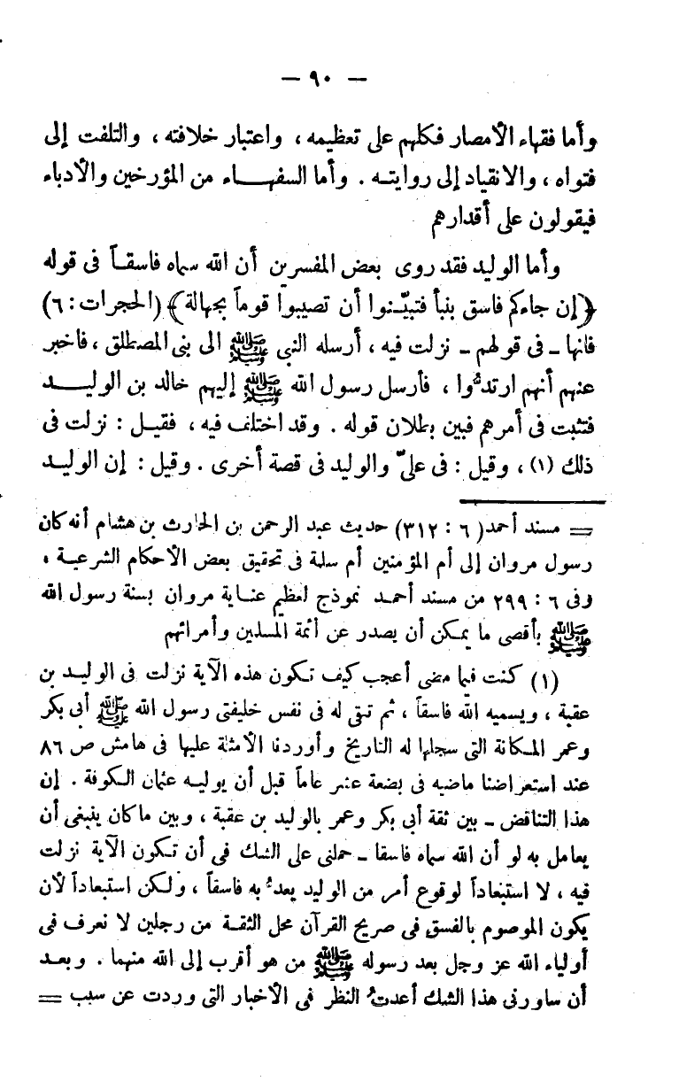 (¬1) كنت فيما مضى أعجب كيف تكون هذه الآية نزلت في الوليد بن عقبة ويسميه الله فاسقا، ثم تبقى له في نفس خليفتي رسول الله صلى الله عليه وسلم أبي بكر وعمر المكانة التي سجلها له التاريخ وأوردنا الأمثلة عليها في هامش ص86 عند استعراضنا ماضيه في بضعة عشر عاما قبل أن يوليه عثمان الكوفة، إن هذا التناقض - بين ثقة أبي بكر وعمر بالوليد بن عقبة، وبين ما كان ينبغي أن يعامل به لو أن الله سماه فاسقا - حملني على الشك في أن تكون الآية نزلت فيه، لا استبعادا لوقوع أمر من الوليد يعد به فاسقا، ولكن استبعادا لأن يكون الموصوم بالفسق في صريح القرآن محل الثقة من رجلين لا نعرف في أولياء الله عز وجل بعد رسوله صلى الله عليه وسلم من هو أقرب إلى الله منهما. وبعد أن ساورني هذا الشك أعدت النظر في الأخبار التي وردت عن سبب نزول الآية " إِنْ جَاءَكُمْ فَاسِقٌ بِنَبَإٍ. . . "، فلما عكفت على دراستها وجدتها موقوفة على مجاهد، أو قتادة أو ابن أبي ليلى، أو يزيد بن رومان، ولم يذكر أحد منهم أسماء رواة هذه الأخبار في مدة مائة سنة أو أكثر مرت بين أيامهم وزمن الحادث، وهذه المائة من السنين حافلة بالرواة من مشارب مختلفة، وإن الذين لهم هوى في تسويء سمعة مثل الوليد ومن هم أعظم مقاما من الوليد قد ملأوا الدنيا أخبارا مريبة ليس لها قيمة علمية. وما دام رواة تلك الأخبار في سبب نزول الآية مجهولين من علماء الجرح والتعديل بعد الرجال الموقوفة هذه الأخبار عليهم، وعلماء الجرح والتعديل لا يعرفون من أمرهم حتى ولا أسمائهم، فمن غير الجائز شرعا وتاريخا الحكم بصحة هذه الأخبار المنقطعة التي لا نسب لها وترتيب الأحكام عليها. وهنالك خبران موصولان أحدهما عن أم سلمة زعم موسى بن عبيدة أنه سمعه من ثابت مولى أم سلمة. وموسى بن عبيدة ضعفه النسائي وابن المديني وابن عدي وجماعة. وثابت المزعوم أنه مولى أم سلمة ليس له ذكر في كل ما رجعت إليه من كتب العلم، فلم يذكر في تهذيب التهذيب ولا في تقريب التهذيب ولا في خلاصة تذهيب الكمال، بل لم أجده ولا في قفصي الاتهام أعني (ميزان الاعتدال) و (لسان الميزان) . وذهبت إلى مجموعة أحاديث أم سلمة في مسند الإمام أحمد فقرأتها واحدا واحدا فلم أجد فيها هذا الخبر، بل لم أجد لأم سلمة أي خبر ذكر فيه اسم مولى لها يدعى ثابتا، زد على كل هذا أن أم سلمة لم تقل في هذا الخبر - إن صح عنها، ولا سبيل إلى أن يصح عنها -: إن الآية نزلت في الوليد، بل قالت - أي قيل على لسانها -: " بعث رسول الله صلى الله عليه وسلم (رجلا) في صدقات بني المصطلق ". والخبر الثاني الموصول رواه الطبري في التفسير عن ابن سعد عن أبيه عن عمه عن أبيه عن أبيه عن ابن عباس: والطبري لم يلق ابن سعد ولم يأخذ عنه، لأن ابن سعد لما توفي ببغداد سنة 230 كان الطبري طفلا في نحو السادسة من عمره ولم يخرج إلى ذلك الحين من بلد آمل في طبرستان لا إلى بغداد ولا لغيرها. وابن سعد وإن كان في نفسه من أهل العدالة في الدين والجلالة في العلم، إلا أن هذه السلسلة من سلفه يجهل علماء الجرح والتعديل أسماء أكثرهم فضلا عن أن يعرفوا شيئا من أحوالهم (وبعد كتابة ما تقدم للطبعة الأولى من كتابنا تبين لي أن ابن سعد الذي روى عنه الطبري هو محمد بن سعد العوفي. وقد وصف الشيخ أحمد شاكر سنده بأنه " سند مسلسل بالضعفاء من أسرة واحدة ". انظر تفسير الطبري طبعة دار المعارف 1: 263 - 264) . فكل هذه الأخبار من أولها إلى آخرها لا يجوز أن يؤاخذ بها مُجاهِدٌ كان موضع ثقة أبي بكر وعمر، وقام بخدمات للإسلام يرجى له بها أعظم المثوبة إن شاء الله. أضف إلى كل ما تقدم أنه في الوقت الذي حدثت فيه لبني المصطلق الحادثة التي نزلت فيها الآية كان الوليد صغير السن كما سيأتي في الفقرة التالية.