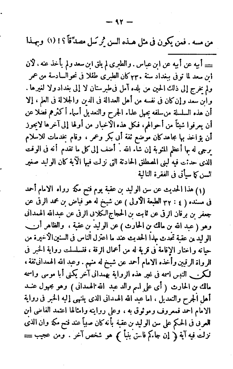 (¬1) هذا الخبر عن سن الوليد بن عقبة يوم فتح مكة رواه الإمام أحمد في مسنده (4: 32 الطبعة الأولى) عن شيخ له هو فياض بن محمد الرقي عن جعفر بن برقان الرقي عن ثابت بن الحجاج الكلابي الرقي عن عبد الله الهمداني وهو (عبد الله بن مالك بن الحارث) عن الوليد بن عقبة، والظاهر أن الوليد بن عقبة تحدث بهذا الحديث عندما اعتزل الناس في السنين الأخيرة من حياته واختار الإقامة في قرية له من أعمال الرقة، فتسلسلت رواية الخبر في الرواة الرقيين وأخذه الإمام أحمد عن شيخ له منهم. وعبد الله الهمداني ثقة، لكن التبس اسمه في غير هذه الرواية بهمداني آخر يكنى أبا موسى واسمه مالك بن الحارث (أي على اسم والد عبد الله الهمداني) وهو مجهول عند أهل الجرح والتعديل، أما عبد الله الهمداني الذي ينتهي إليه الخبر في رواية الإمام أحمد فمعروف وموثوق به، وعلى روايته وأمثالها اعتمد القاضي ابن العربي في الحكم على سن الوليد بن عقبة بأنه كان صبيا عند فتح مكة وأن الذي نزلت فيه آية " إََِنْ جَاءَكُمْ فَاسِقٌ بِنَبَإٍ " هو شخص آخر. ومن عجيب أمر الذين كان لهم هوى في تشويه هذا الصحابي الشاب المجاهد الطيب النفس الحسن السيرة في الناس أنهم حاولوا إدحاض حجة صغر سنه في ذلك الوقت بخبر آخر روي عن قدومه مع أخيه عمارة إلى المدينة في السنة السابعة للهجرة ليطلبا من النبي صلى الله عليه وسلم رد أختهما أم كلثوم إلى مكة. وأصل هذا الخبر - إن صح - مقدّم فيه اسم عمارة على اسم الوليد، وهذا مما يستأنس به في أن عمارة هو الأصل في هذه الرحلة وأن الوليد جاء في صحبته، وأي مانع يمنع قدوم الوليد صبيا بصحبة أخيه الكبير كما يقع مثل ذلك في كل زمان ومكان؟ فقول الوليد إنه كان في سنة الفتح صبيا ليس في خبر قدومه مع أخيه الكبير إلى المدينة في السنة السابعة ما يمنعه أو يناقضه. فإذا تقرر عندك أن جميع الأخبار الواردة بشأن الوليد بن عقبة في سبب نزول آية " إََِنْ جَاءَكُمْ فَاسِقٌ بِنَبَإٍ " لا يجوز علميا أن يبنى عليها حكم شرعي أو تاريخي، وإذا أضفت إلى ذلك حديث مسند الإمام أحمد عن سن الوليد في سنة الفتح، يتبين لك بعد ذلك حكمة استعمال أبي بكر وعمر للوليد وثقتهما به واعتمادهما عليه مع أنه كان لا يزال في صدر شبابه.