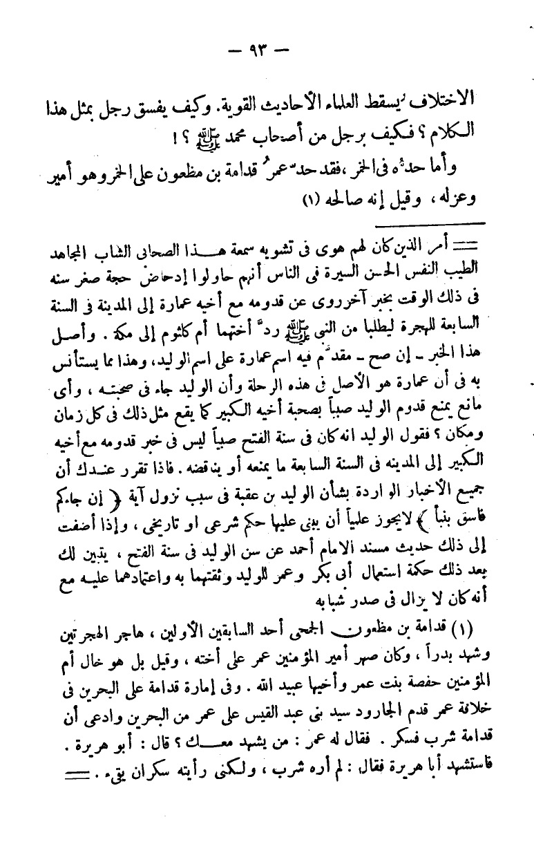 (¬1) قدامة بن مظعون الجمحي أحد السابقين الأولين، هاجر الهجرتين وشهد بدرا، وكان صهر أمير المؤمنين عمر على أخته، وقيل بل هو خال أم المؤمنين حفصة بنت عمر وأخيها عبيد الله. وفي إمارة قدامة على البحرين في خلافة عمر قدم الجارود سيد بني عبد القيس على عمر من البحرين وادعى أن قدامة شرب فسكر. فقال له عمر: من يشهد معك؟ قال: أبو هريرة. فاستشهد أبا هريرة فقال: لم أره شرب، ولكني رأيته سكران يقيء فقال له عمر: لقد تنطعت في الشهادة. واستقدم قدامة من البحرين، فقال الجارود لعمر: أقم على هذا كتاب الله، فقال له عمر: أخصم أنت أم شهيد؟ فقال: شهيد. فقال عمر: قد أديت شهادتك. فصمت الجارود. ثم غدا على عمر فقال: أقم على هذا حد الله. فقال عمر: لتمسكن لسانك أو لأسوأنك. فقال: يا عمر، ما ذلك بالحق أن يشرب ابن عمك الخمر وتسوءني. ثم جيء بزوجة لقدامة فأقامت الشهادة على زوجها. وأراد عمر أن يقيم عليه الحد. فقال له الصحابة: لا نرى أن تحده ما دام مريضا، ثم عاوده فقالوا له كما قالوا من قبل فقال عمر: لأن يلقى الله تحت السياط أحب إلي من أن ألقاه وهو في عنقي، وجلده. فغاضبه قدامة. وعند قفولهما من الحج جيء به إلى عمر فكلمه عمر واستغفر له. ومن حسن حظ قدامة بن مظعون أنه قرشي من بني جمح. ولو أنه كان قرشيا من بني عبد شمس لانطلقت ألسنة السوء بالبذاءة عليه واختراع الأكاذيب فيه ما دام في الدنيا كذب.
