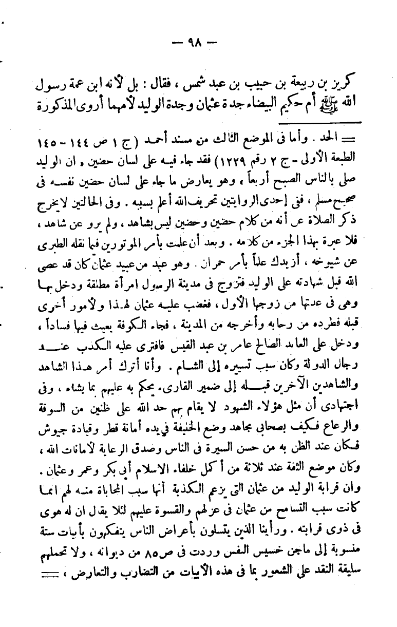 بن ربيعة بن حبيب بن عبد شمس، فقال: بل لأنه ابن عمة رسول الله صلى الله عليه وسلم أم حكيم البيضاء، وجدة عثمان وجدة الوليد لأمهما أروى المذكورة أم حكيم توأمة عبد الله أبي رسول الله صلى الله عليه